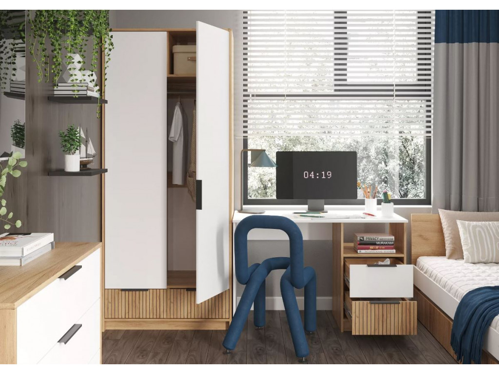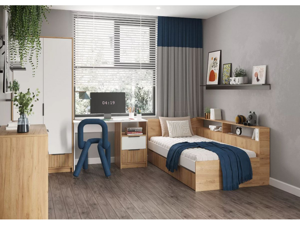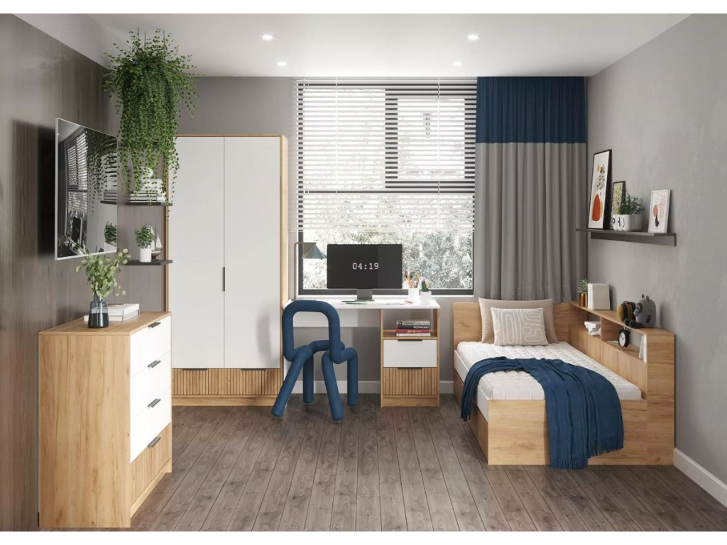 ИВИС - комплект мебели для современной квартиры. Функциональные места для хранения открытые полки и закрытые ящики позволяют разместить в комнате всё необходимое. Корпус / фасад: ЛДСП Цвет корпуса: Дуб Крафт золотой Цвет фасада: Белый (Гладкий) и фотопечать в виде вертикальной фрезеровки.