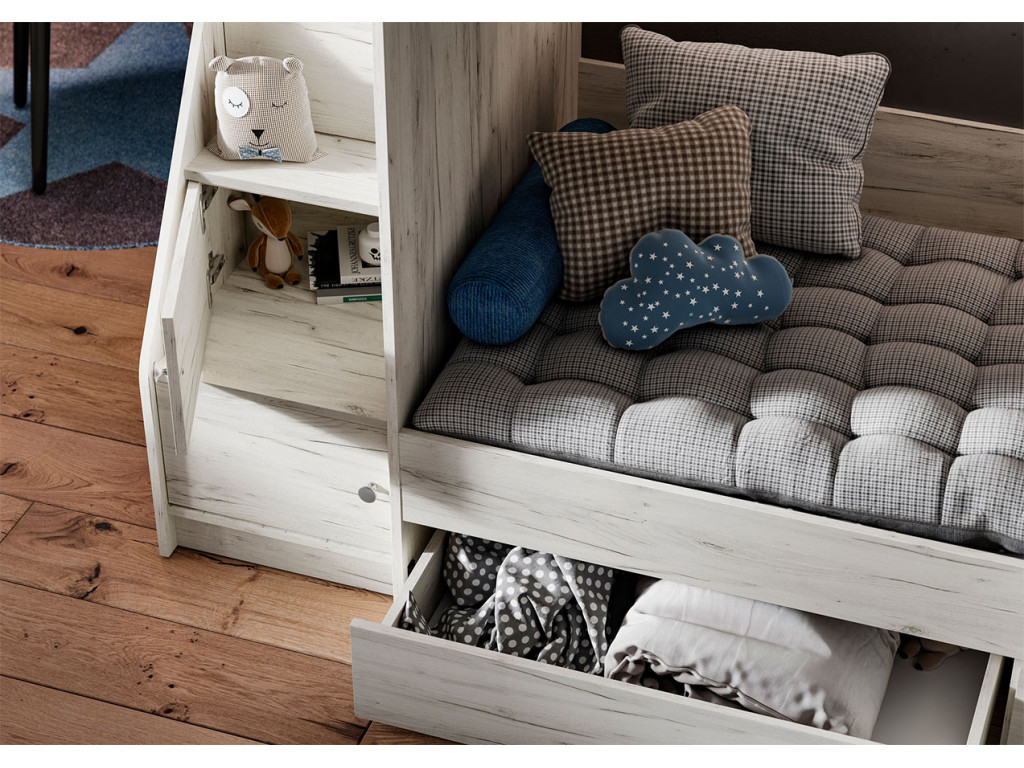 Эта кровать сочетает в себе стильный дизайн и функциональность, позволяя эффективно использовать площадь комнаты. Верхний ярус идеально подойдет для подростка или гостя, а нижний ярус — для постоянного использования или для дополнительного спального места.