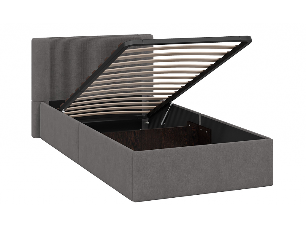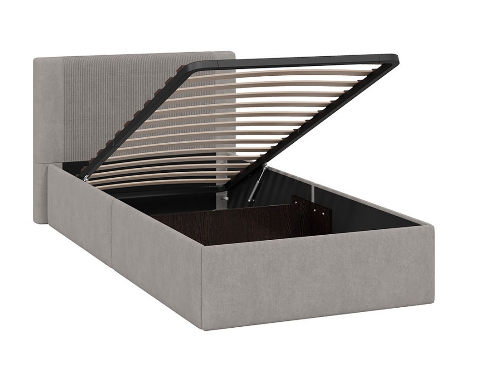Функциональность. Кровать оборудована подъемным механизмом, обеспечивающим верхнюю фиксацию и удобный доступ к месту для хранения, а усиленная царга и дополнительное металлическое соединение повышают прочность конструкции.