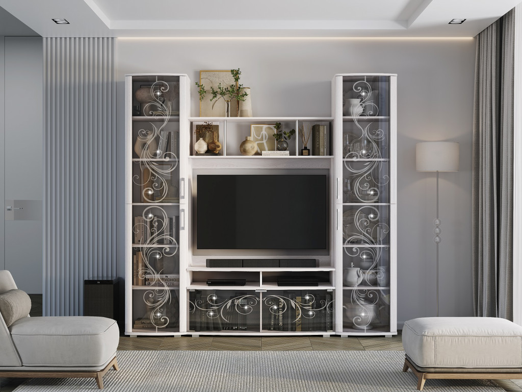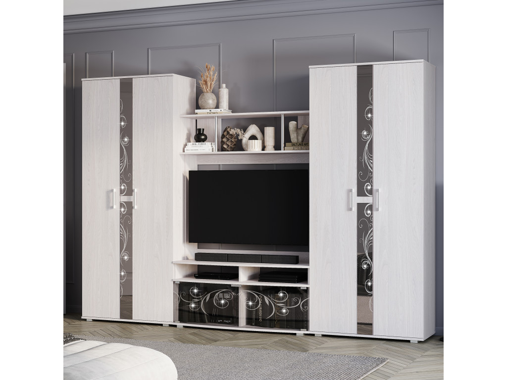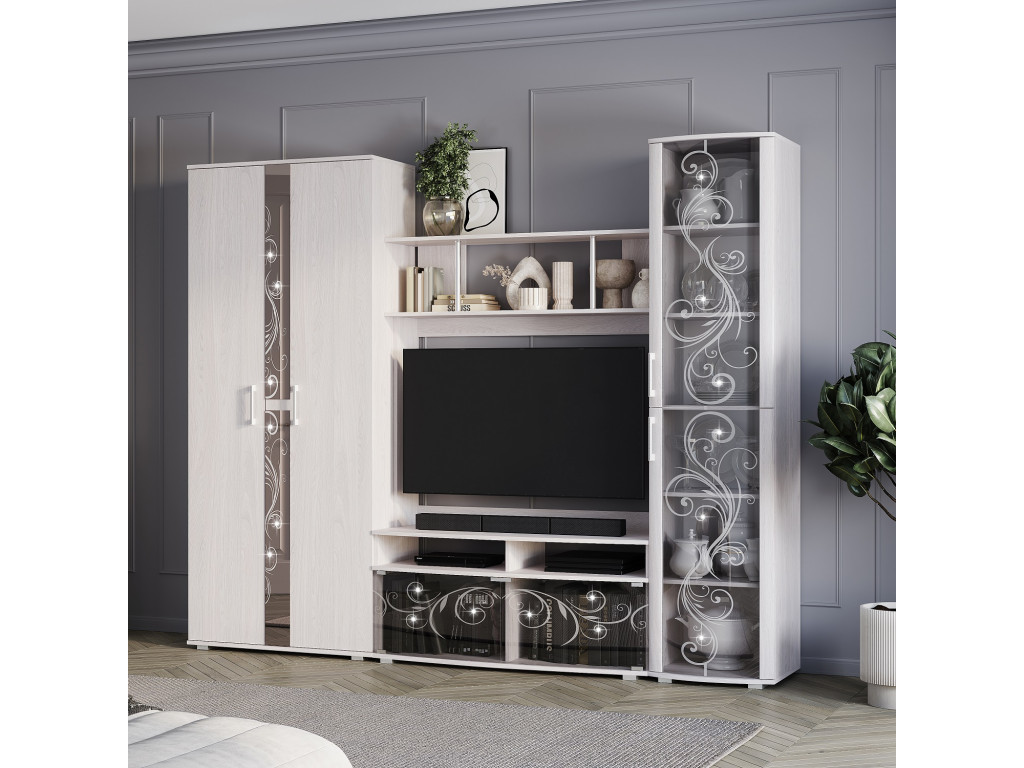 Гостиная "Флоренция" отличается утонченным дизайном и практичностью. Оттенок "белый ясень" в сочетании с растительным принтом придают помещению свежесть и легкость.