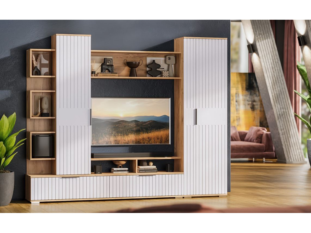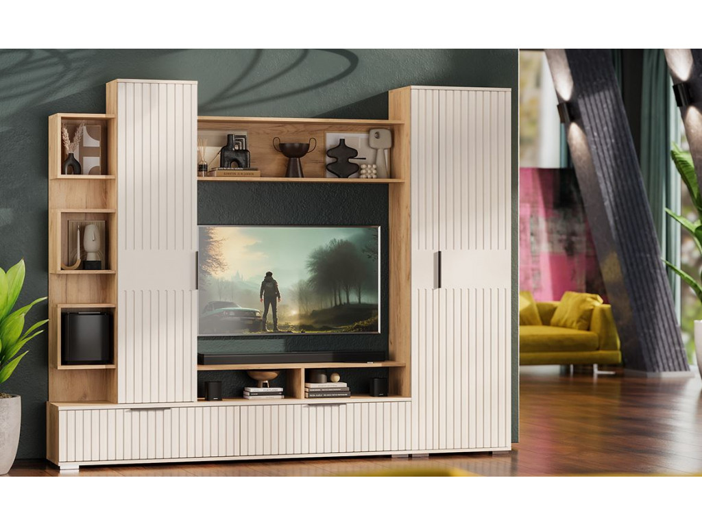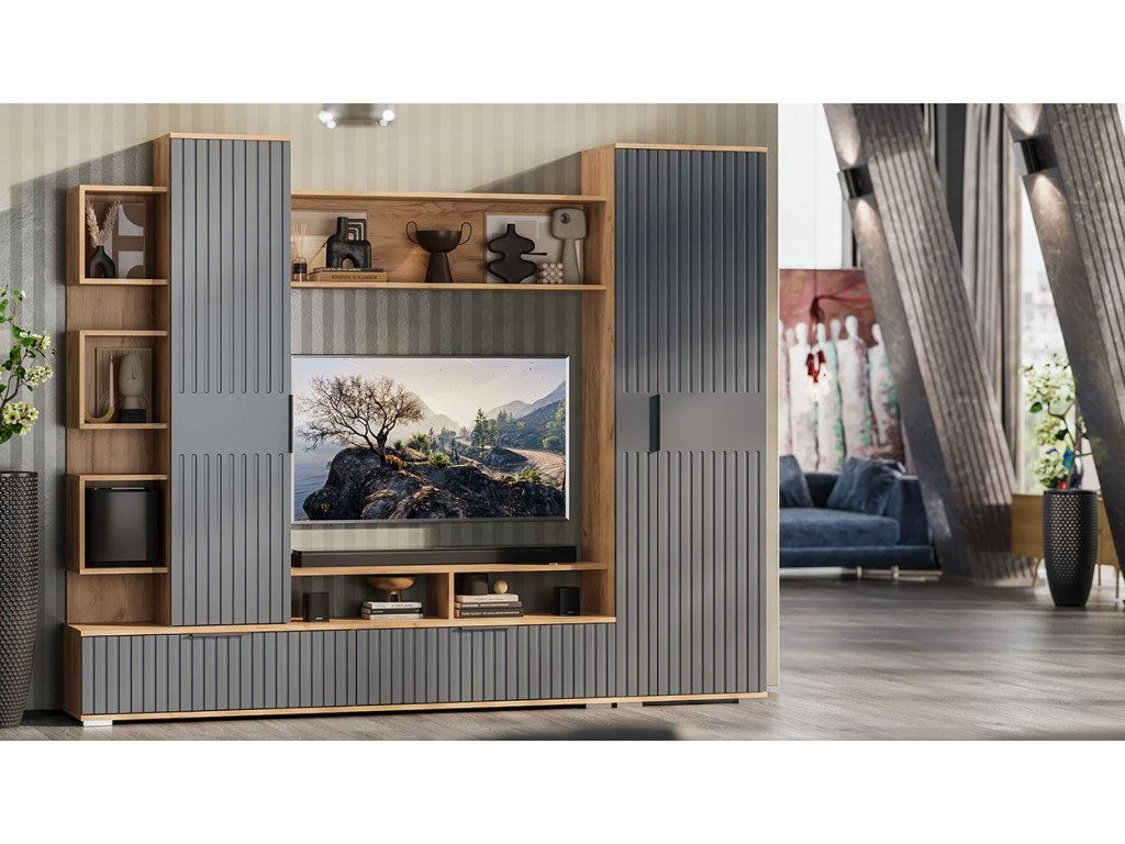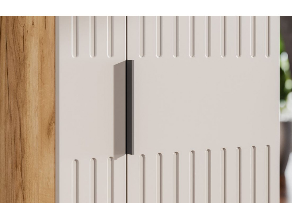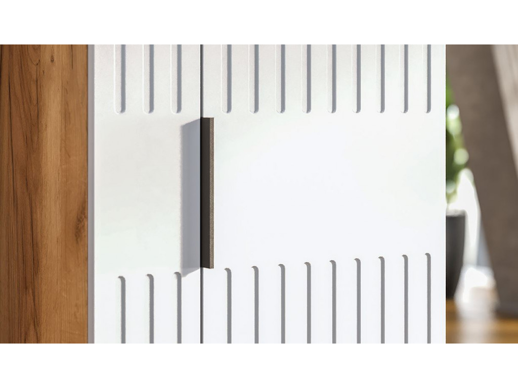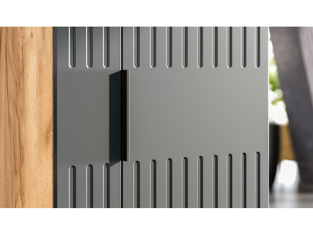 Декор. Важной особенностью новинки являются фасады с рельефной фрезеровкой, которые создают особый эффект света и теней, наполняют интерьер динамикой и движением, придают необычный облик повседневным предметам. Дизайн фасадов с вертикальными линиями меняет восприятие пространства — визуально раздвигает границы, добавляет воздушности. Цвет торцевых металлических ручек гармонично сочетается с фасадами, создавая современный и элегантный облик гостиной.