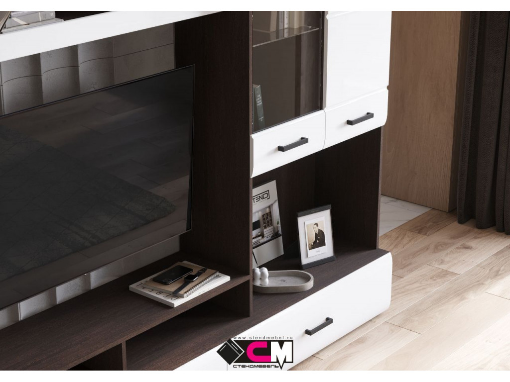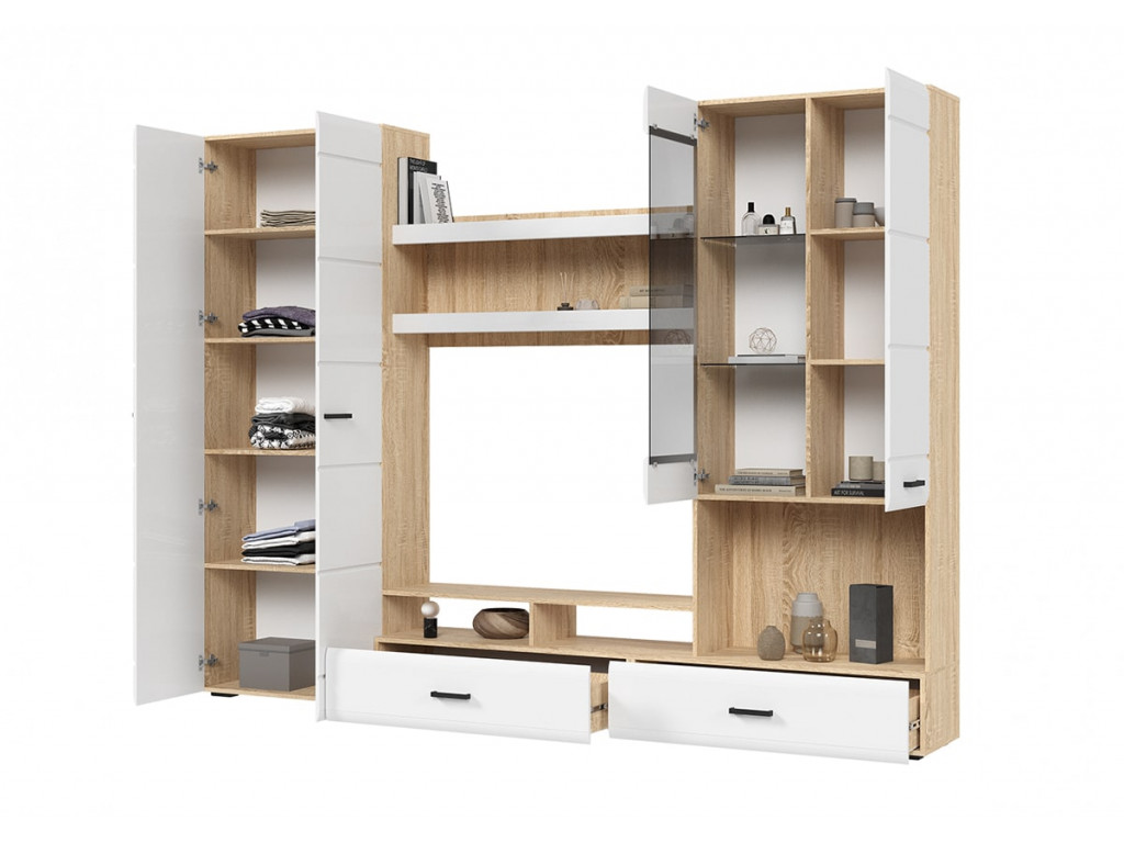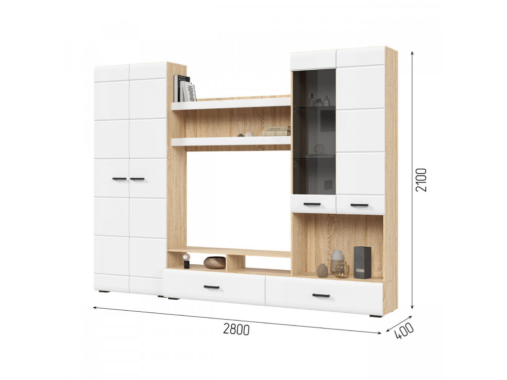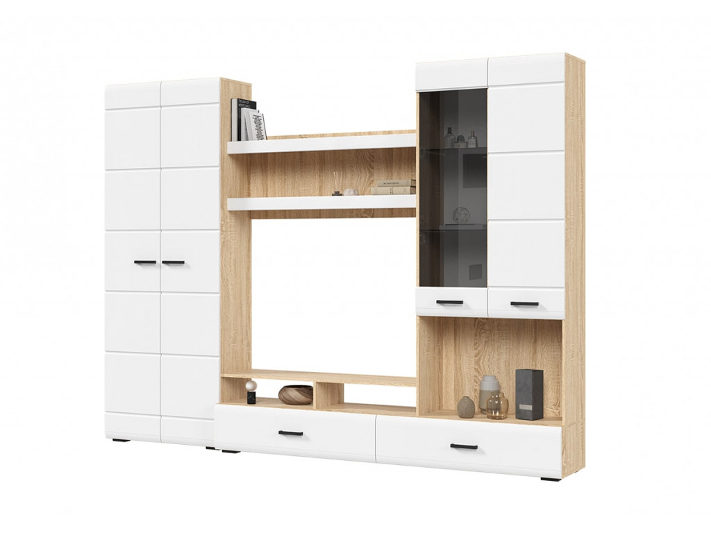 Готовое решение для гостиной «Либерти» помогает создать современный и функциональный интерьер без лишних усилий. Комплект включает вместительный шкаф с полками, секцию для телевизора, витрину с полками и выдвижные ящики для хранения. Глянцевые фасады с элегантной фрезеровкой подчеркивают строгую геометрию линий и наполняют интерьер светом. Витрина с прозрачными стеклянными полками идеально подходит для размещения декоративных элементов и книг. Сдержанное сочетание теплого древесного декора корпуса и белого глянца фасадов придает гостиной легкость, а чёрные ручки акцентируют современный характер коллекции. Корпус: ЛДСП 16 мм Фасад: МДФ 16 мм Ручки: ручка накладная, 128 мм, черный пластик Направляющие полного выдвижения.