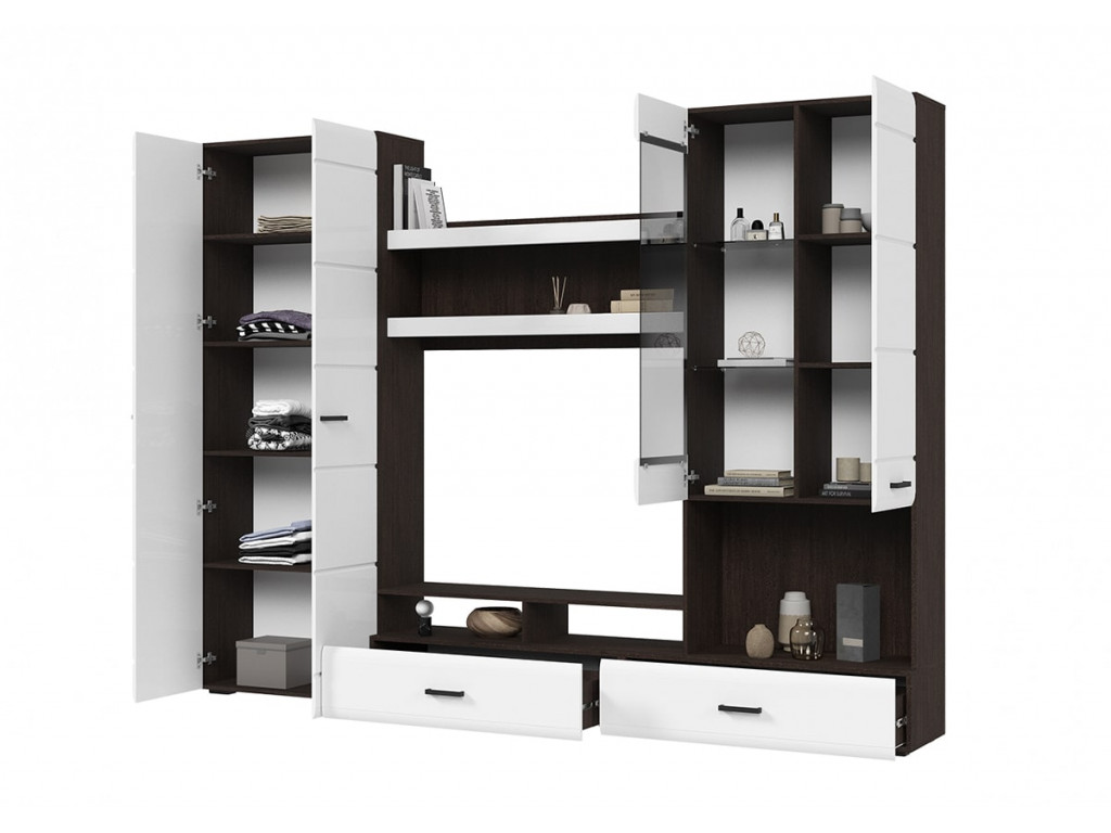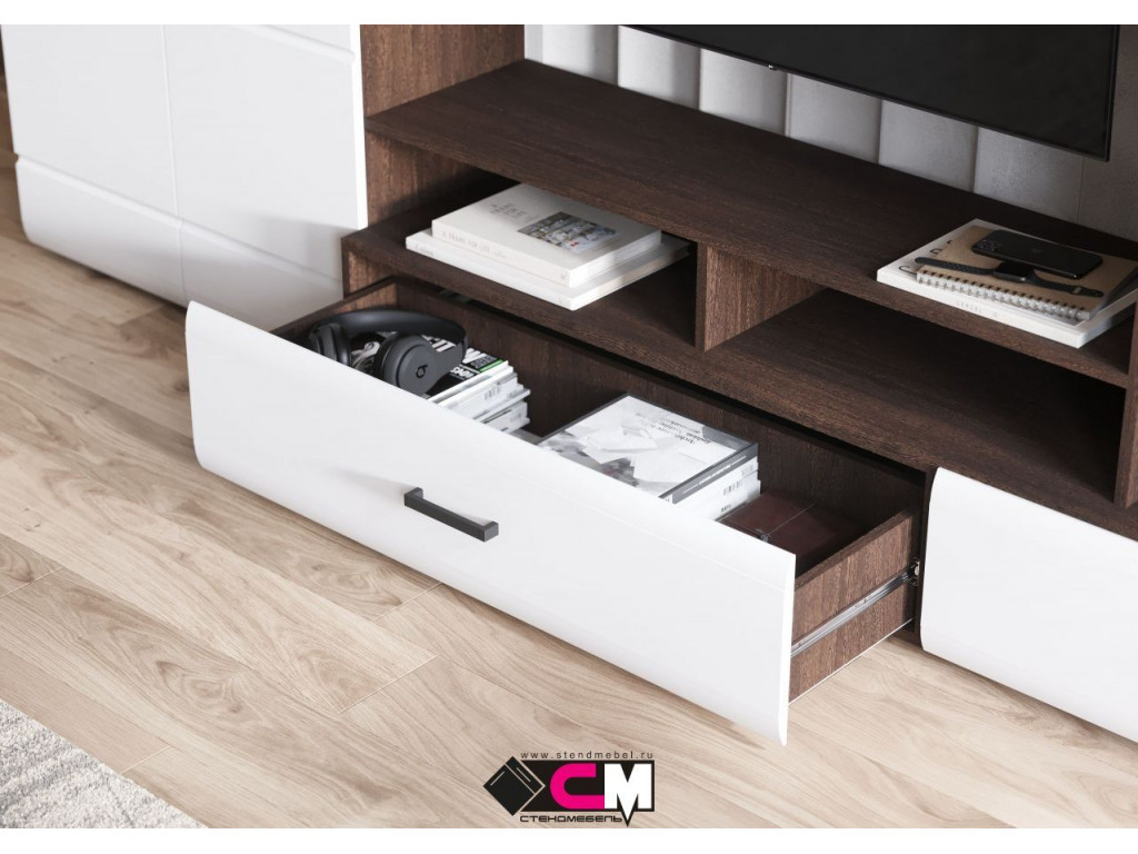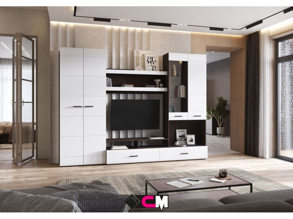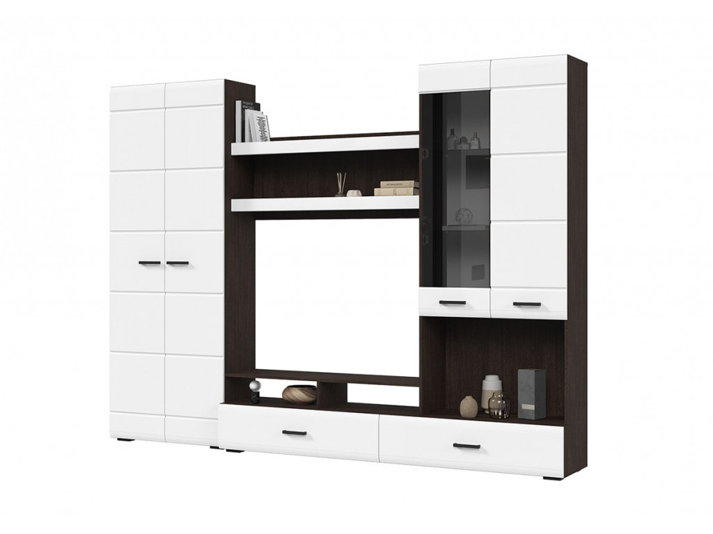 Готовое решение для гостиной «Либерти» помогает создать современный и функциональный интерьер без лишних усилий. Комплект включает вместительный шкаф с полками, секцию для телевизора, витрину с полками и выдвижные ящики для хранения. Глянцевые фасады с элегантной фрезеровкой подчеркивают строгую геометрию линий и наполняют интерьер светом. Витрина с прозрачными стеклянными полками идеально подходит для размещения декоративных элементов и книг. Сдержанное сочетание теплого древесного декора корпуса и белого глянца фасадов придает гостиной легкость, а чёрные ручки акцентируют современный характер коллекции. Корпус: ЛДСП 16 мм Фасад: МДФ 16 мм Ручки: ручка накладная, 128 мм, черный пластик Направляющие полного выдвижения.