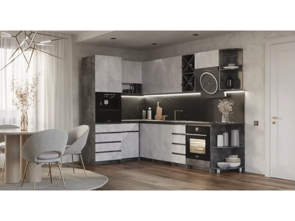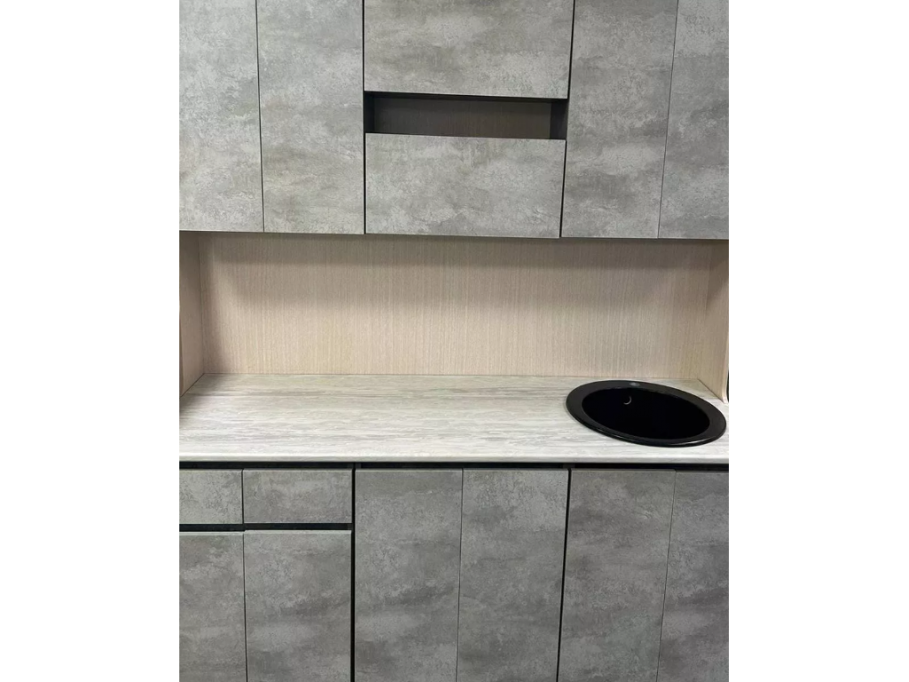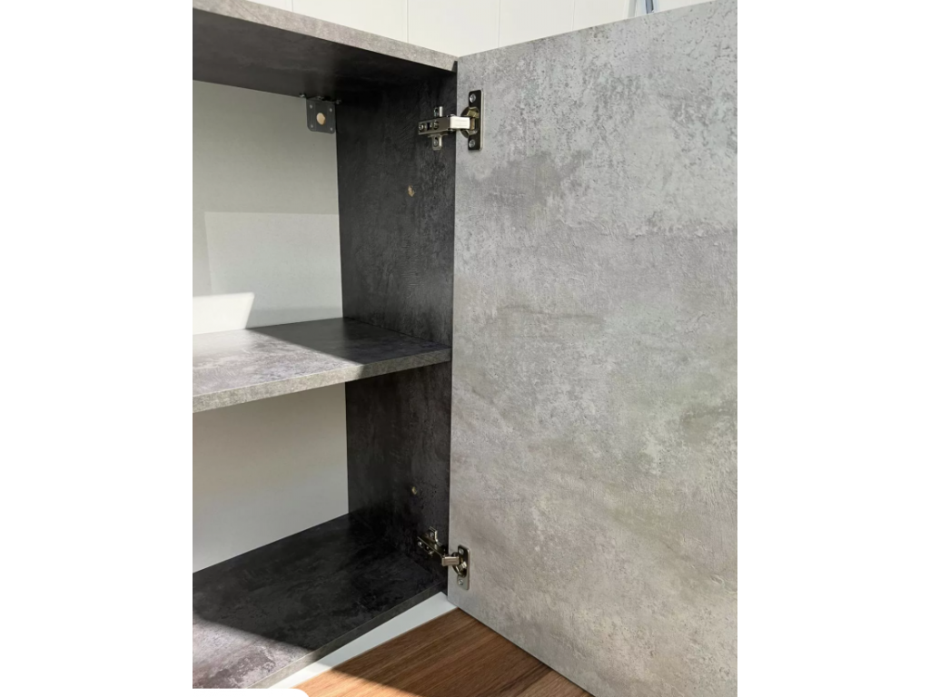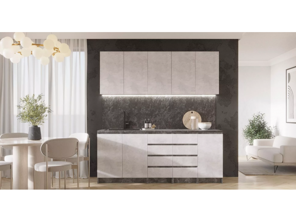 Кухня выполнена в минималистичном дизайне: цельные поверхности, строгая геометрия шкафов и лаконичный декор. Корпус и фасад имеют современное и практичное цветовое решение: Цемент темный / Цемент светлый.