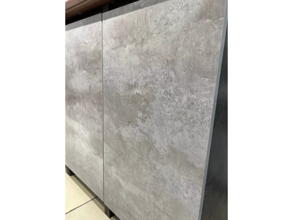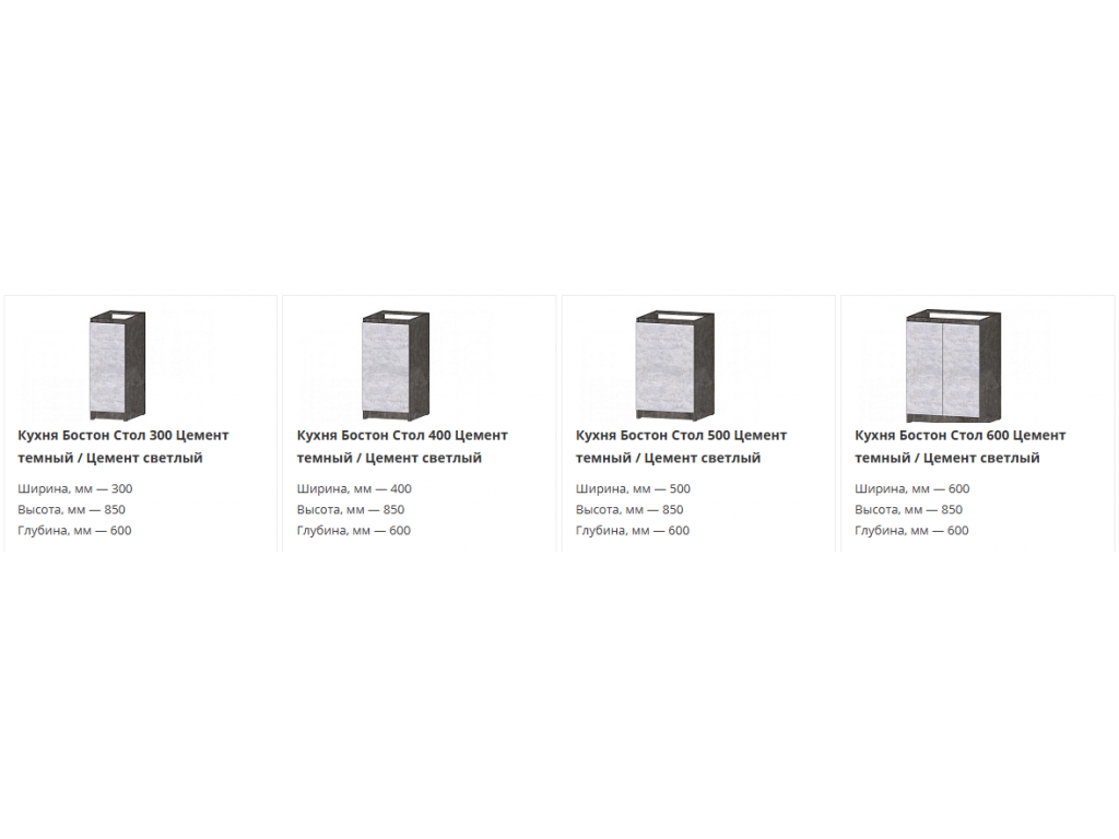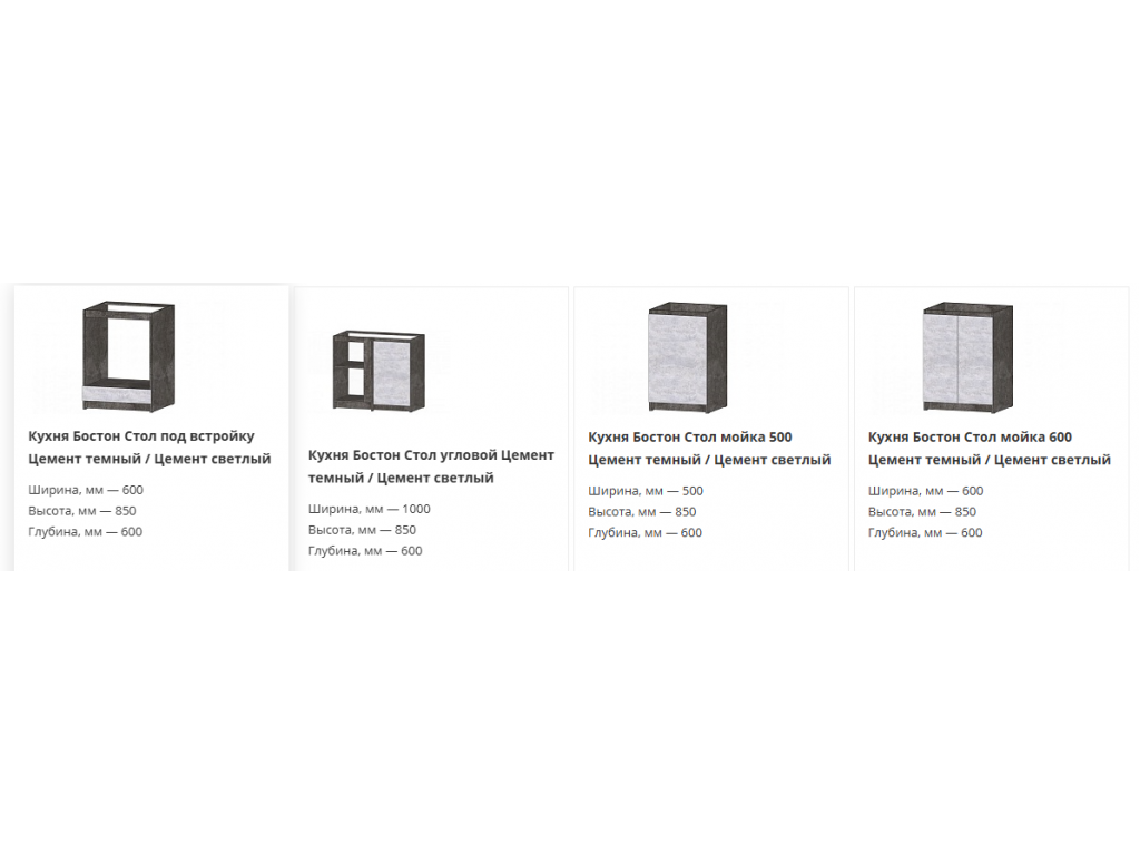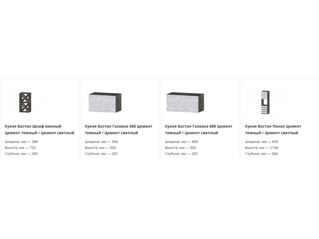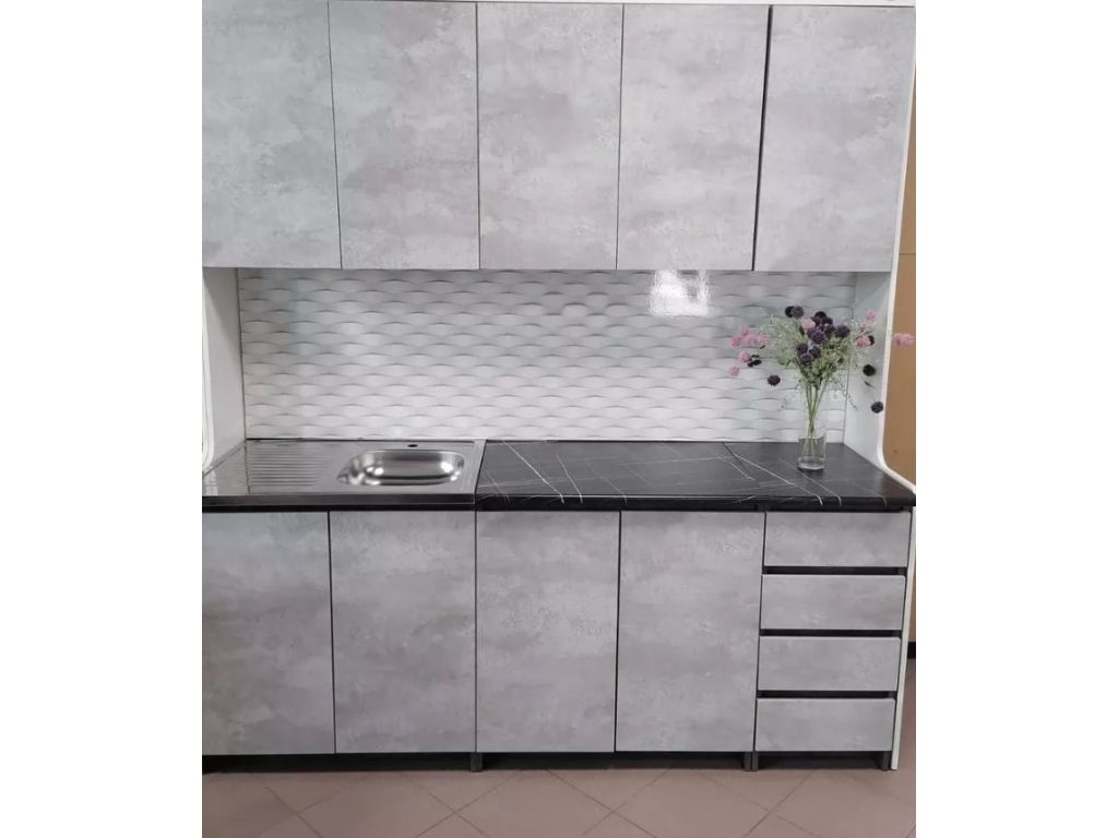 Кухня выполнена в минималистичном дизайне: цельные поверхности, строгая геометрия шкафов и лаконичный декор. Корпус и фасад имеют современное и практичное цветовое решение: Цемент темный / Цемент светлый.
