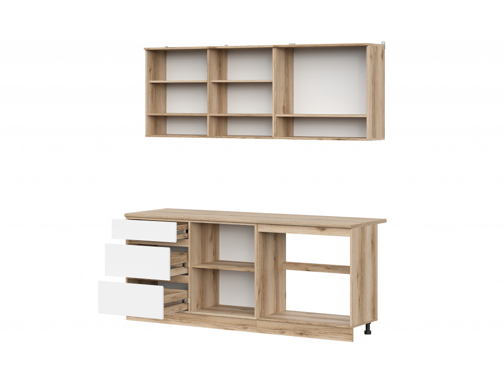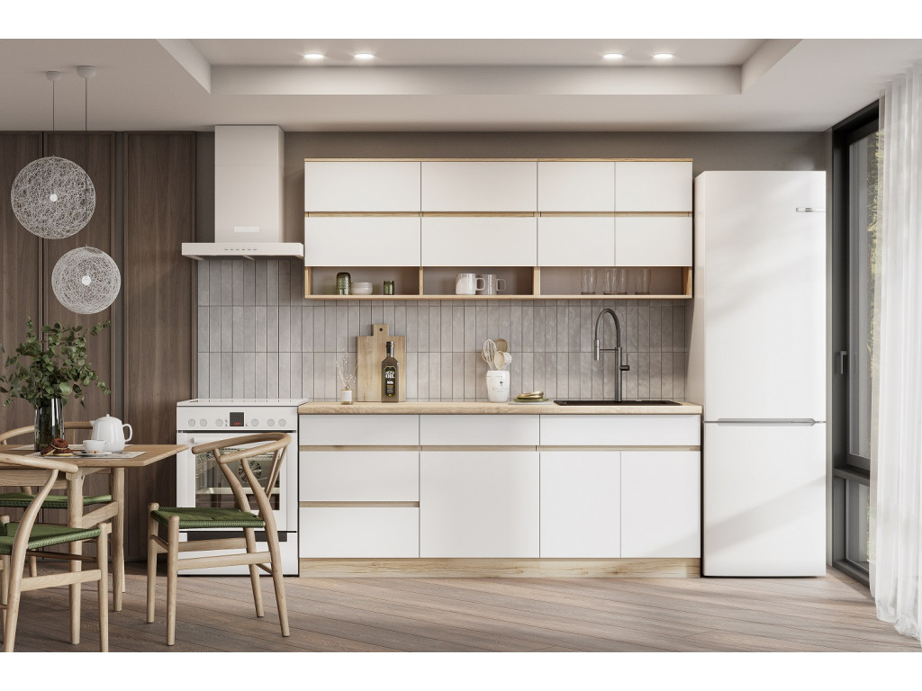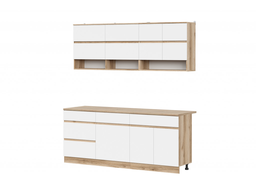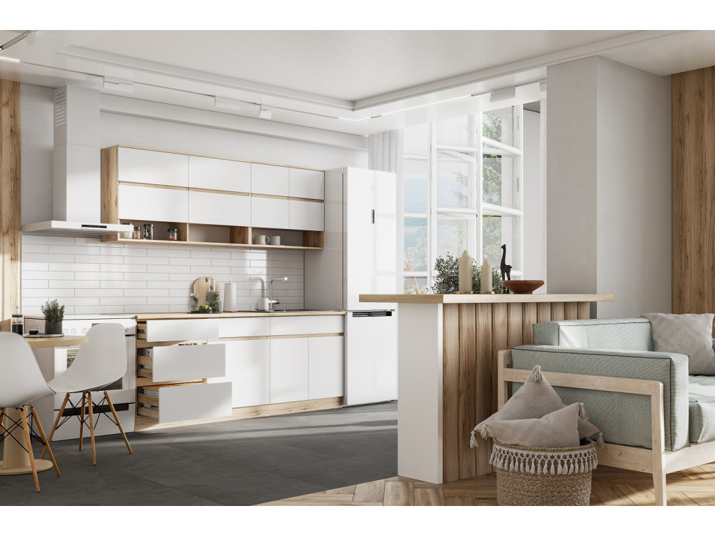 Столешница выполнена в цвете дуб сонома толщиной 26 мм, придавая интерьеру теплый и естественный вид, а также обеспечивая надежность и износостойкость. Корпус кухни выполнен в насыщенном цвете дуб делано, а фасады из ЛДСП — в чистом белом цвете, что создает светлый и свежий образ, визуально расширяя пространство.