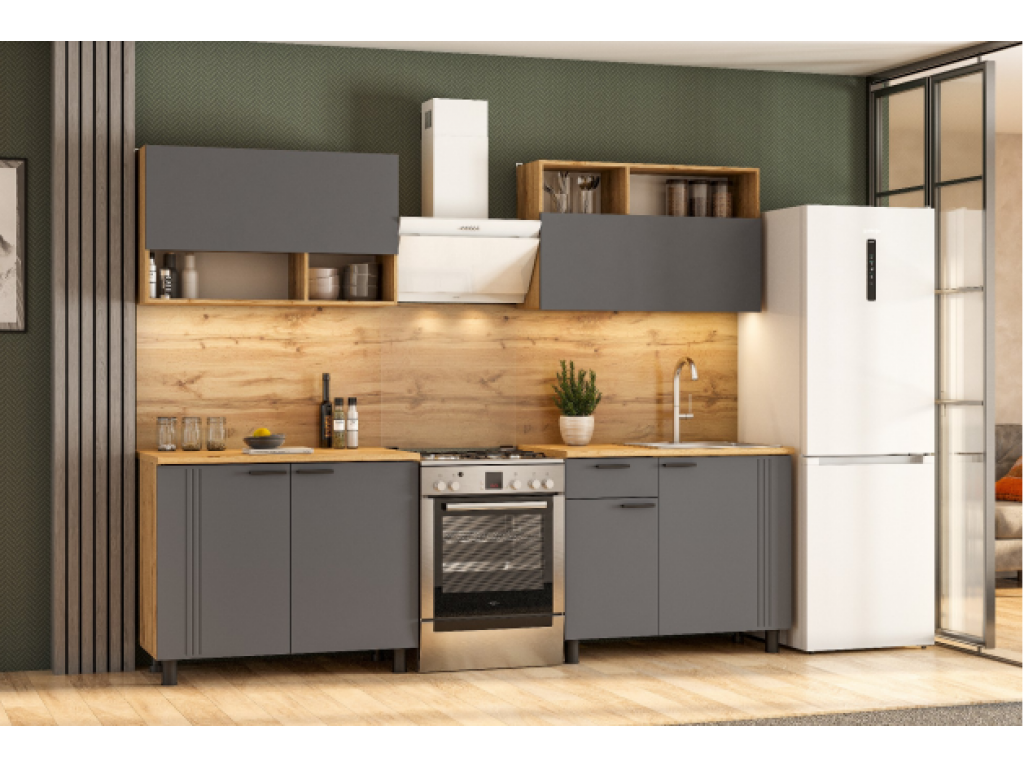 Сборка нижнего комбинированного стола и барного навесного шкафа универсальная. Фасады верхних модулей не имеют ручек, открытие за нижний край фасада. Максимальная нагрузка на полки и ящики 5 кг.