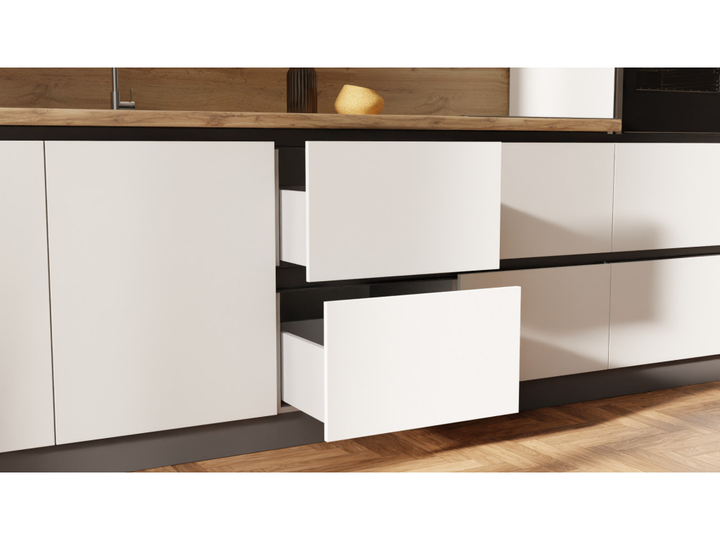 | Фурнитура | Металлические ручки Gola, шариковые направляющие, петли без доводчиков. |