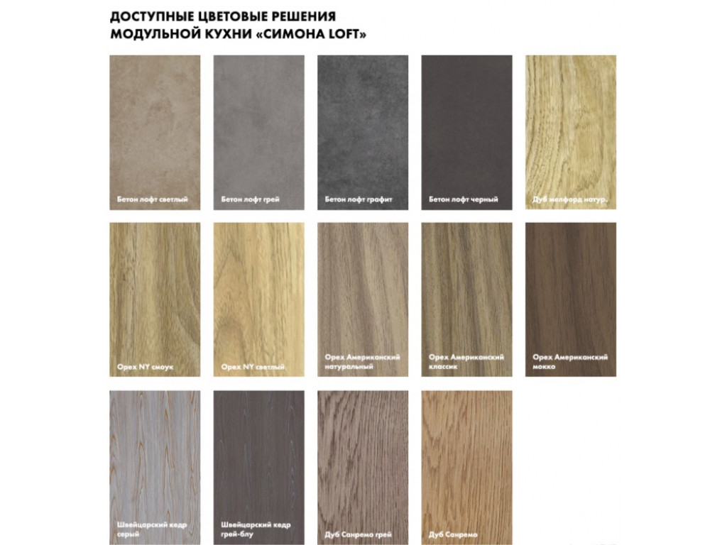 Расширенная коллекция модульных кухонь «Симона LOFT». Невероятно реалистичные оттенки дерева и бетона представлены в широком ассортименте, выбор от светлых натуральных тонов до глубоких кофейных и графитовых позволит создать кухню, подходящую для любого интерьера.