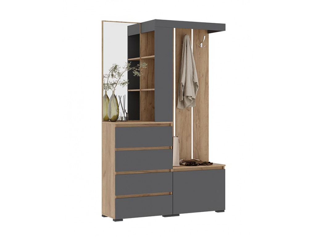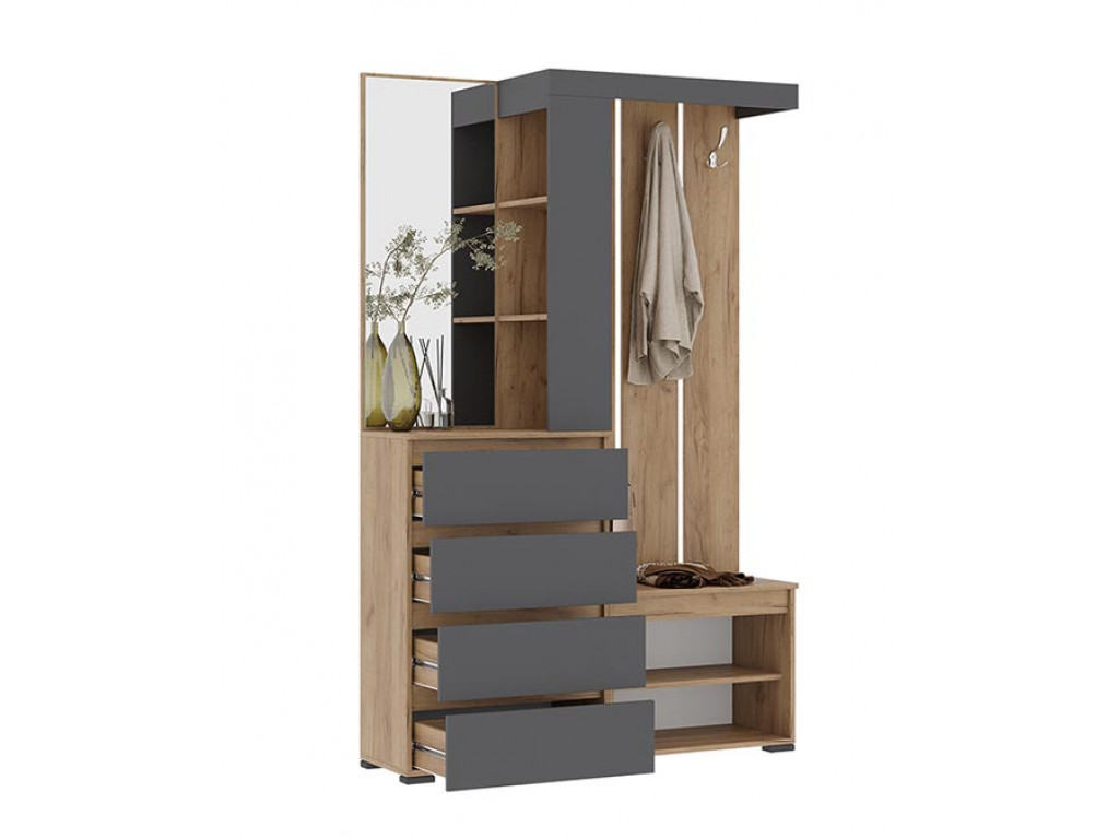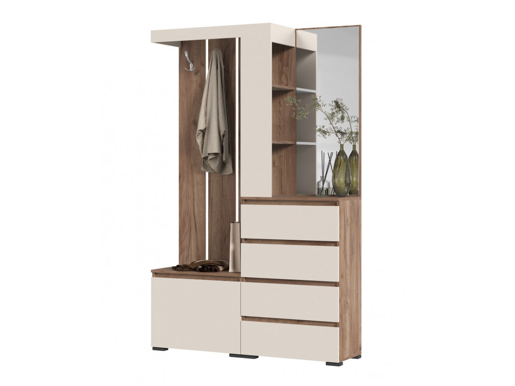 скандинавском стиле. Комплектация прихожей включает в себя встроенный комод с четырьмя выдвижными ящиками, обработанное еврокромкой зеркало, и торцевой стеллаж для мелочей. Вторая секция представлена открытой вешалкой с четырьмя хромированными крючками для одежды и закрытой обувницей с двумя полками.