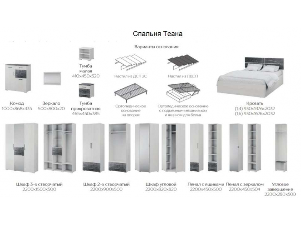 Кровати имеют три варианта оснований на выбор: настил из ДСП 2с, ортопедическое на независимых опорах или ортопедическое с подъемным механизмом и ящиком для хранения белья.