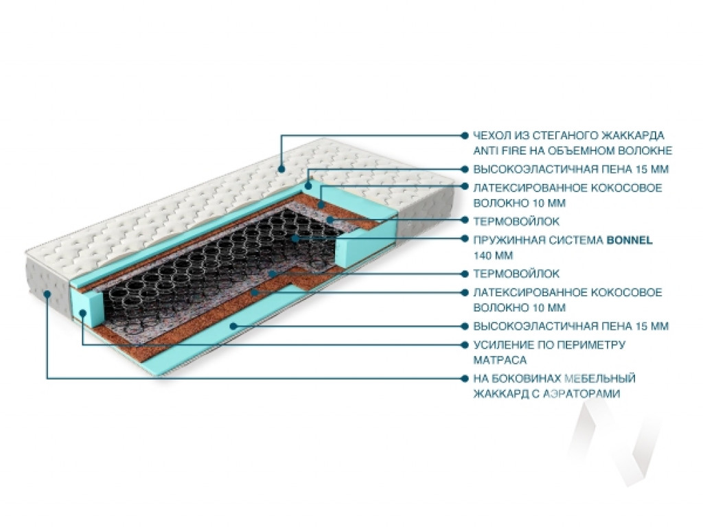 | Наполнение | Пена 15мм, латексированное кокосовое волокно 10мм, термовойлок, пружинная система Bonnel 140мм, термовойлок, латексированное кокосовое волокно 10мм, пена 15мм. Чехол: из жаккарда Anti Fire, стеганого на объемном волокне |