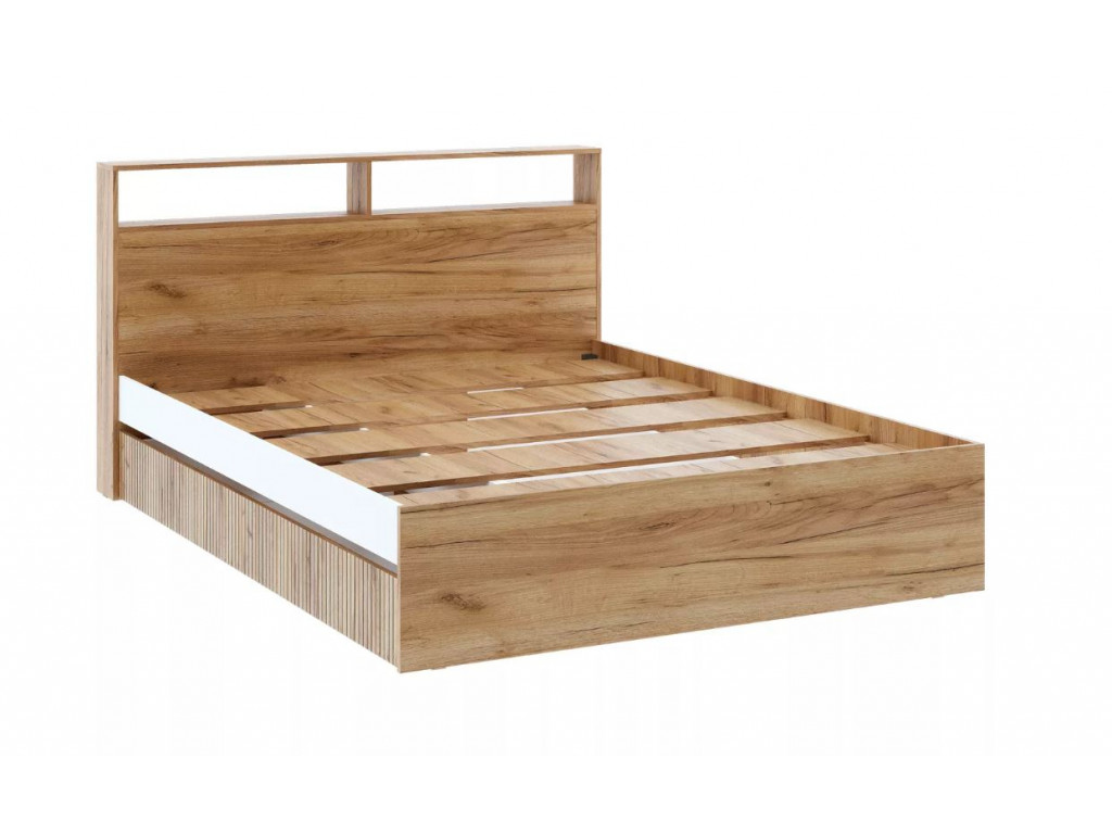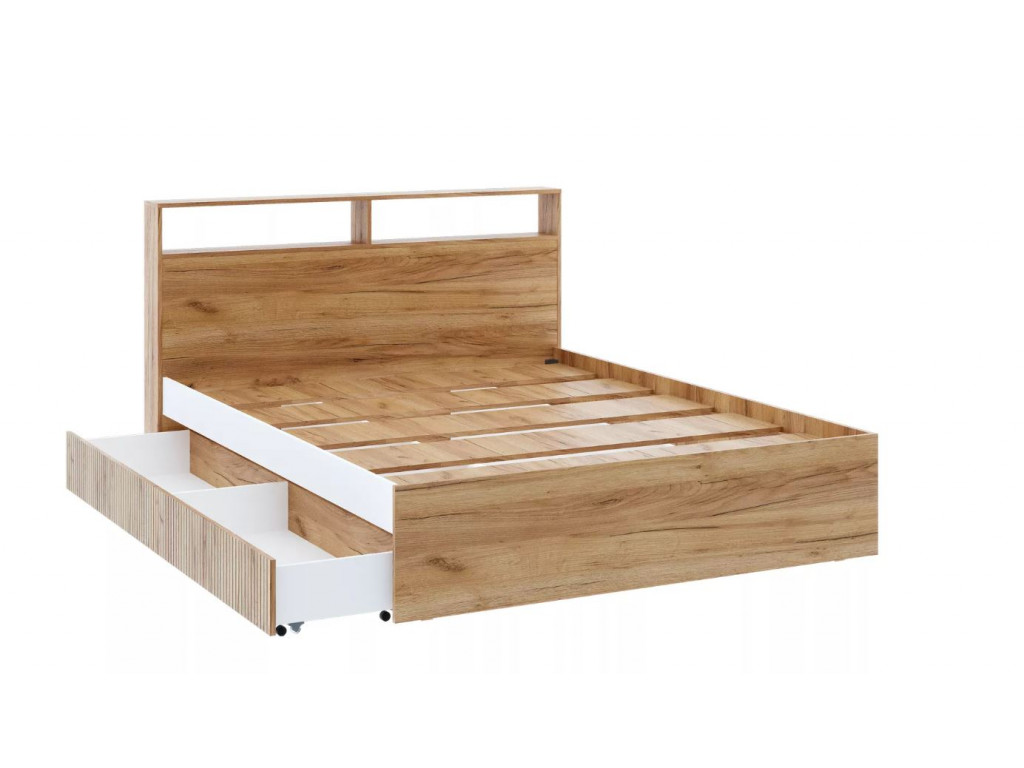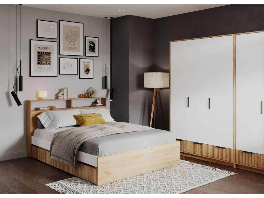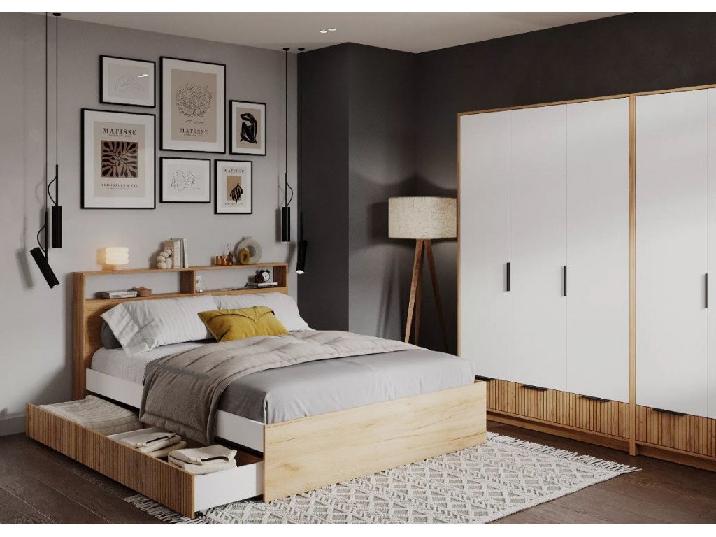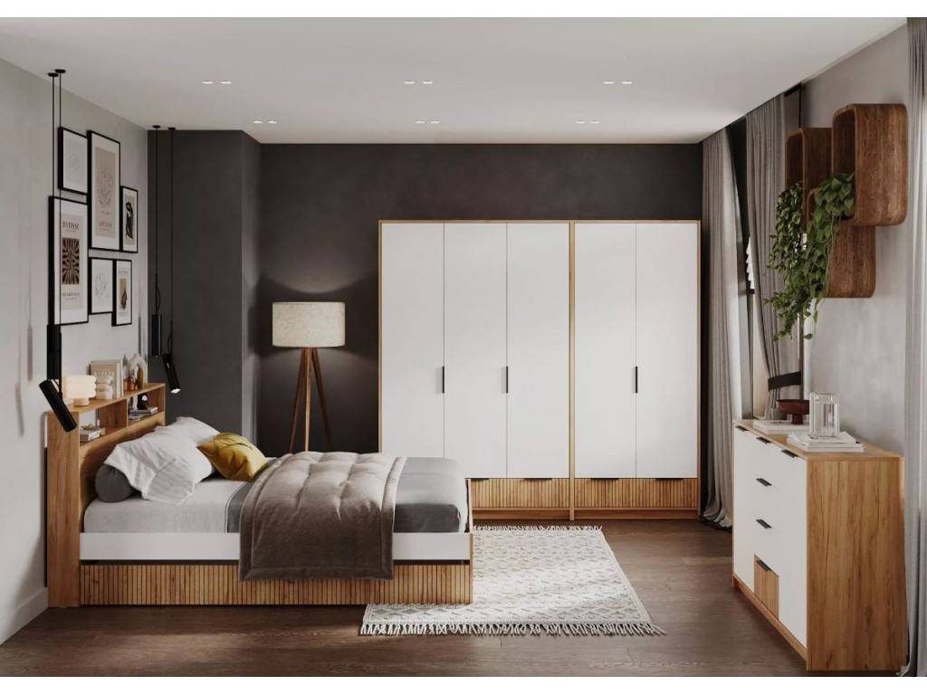 ИВИС - комплект мебели для современной квартиры. Функциональные места для хранения открытые полки и закрытые ящики позволяют разместить в спальне всё необходимое. Корпус / фасад: ЛДСП Цвет корпуса: Дуб Крафт золотой Цвет фасада: Белый (Гладкий) и фотопечать в виде вертикальной фрезеровки.