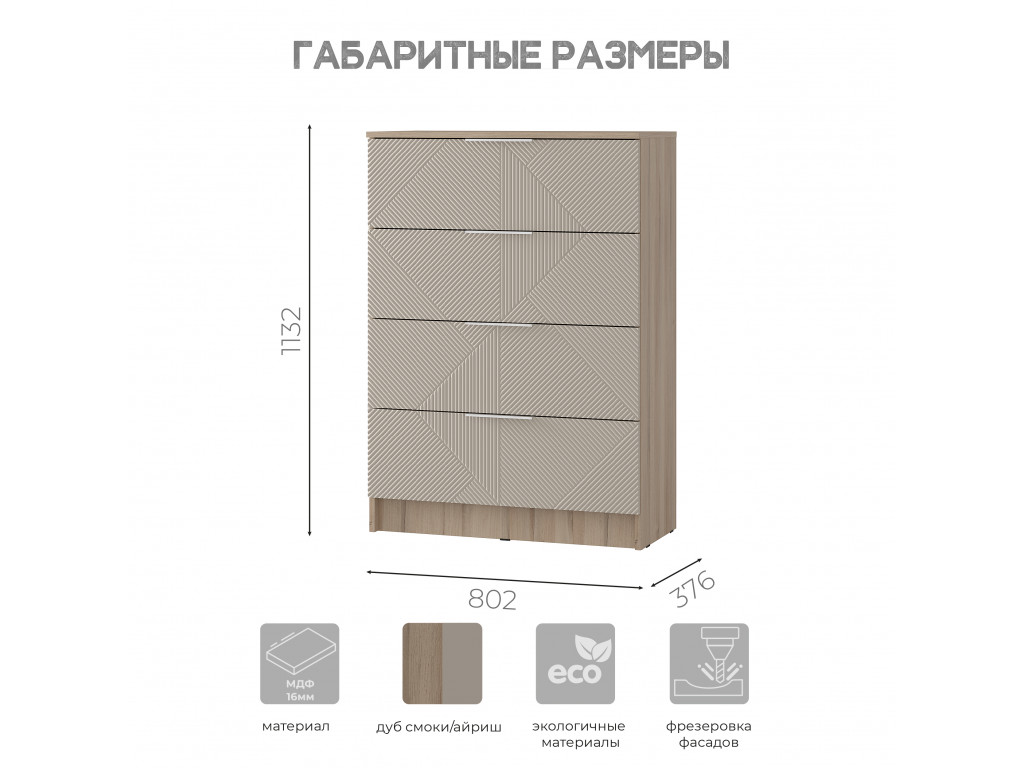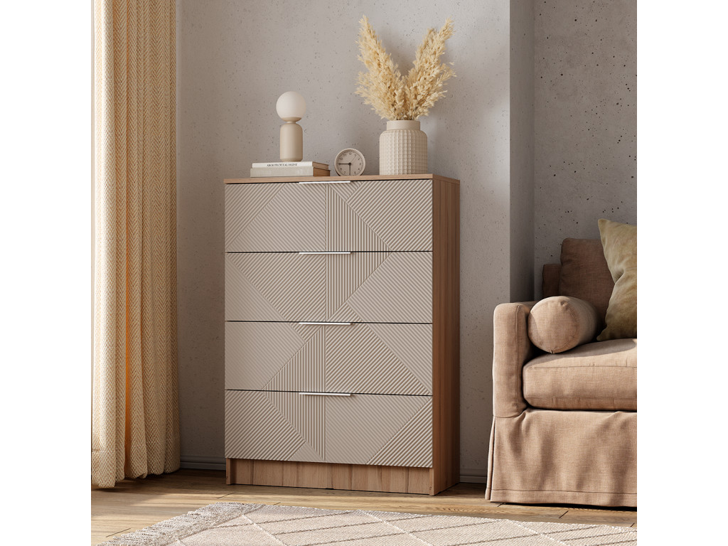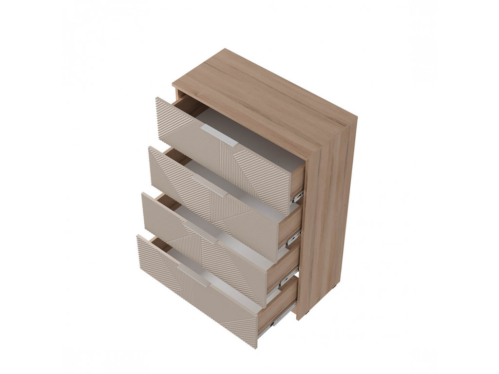 Комод "Эмилия" КМ-02 обладает четырьмя просторными ящиками для одежды и белья. Благодаря эргономичным фасадам открывание ящиков становится удобным и лёгким.