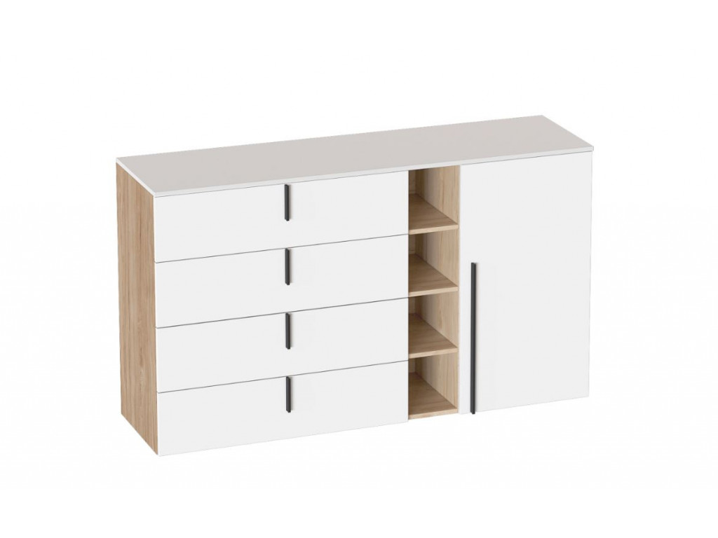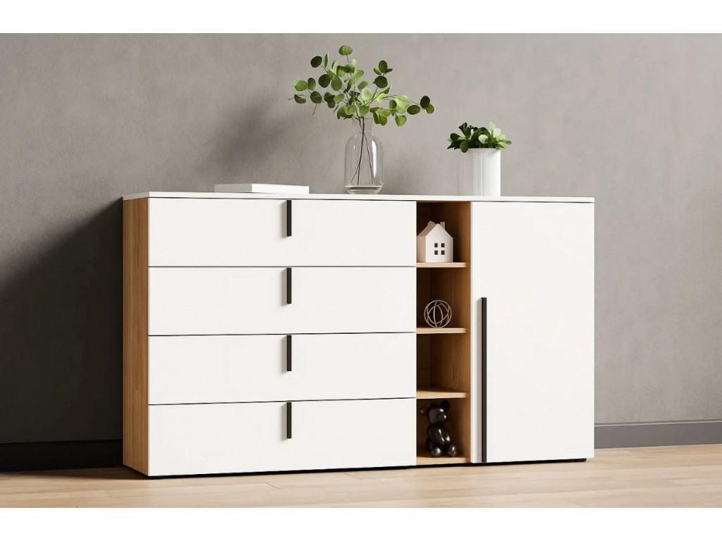 Внутри комода пространство разделено на 3 секции, в левой находится 4 ящика на шариковых направляющих. Средняя секция - открытая с полками. Правая секция закрыта распашной дверью, за которой расположены 2 стационарные полки.