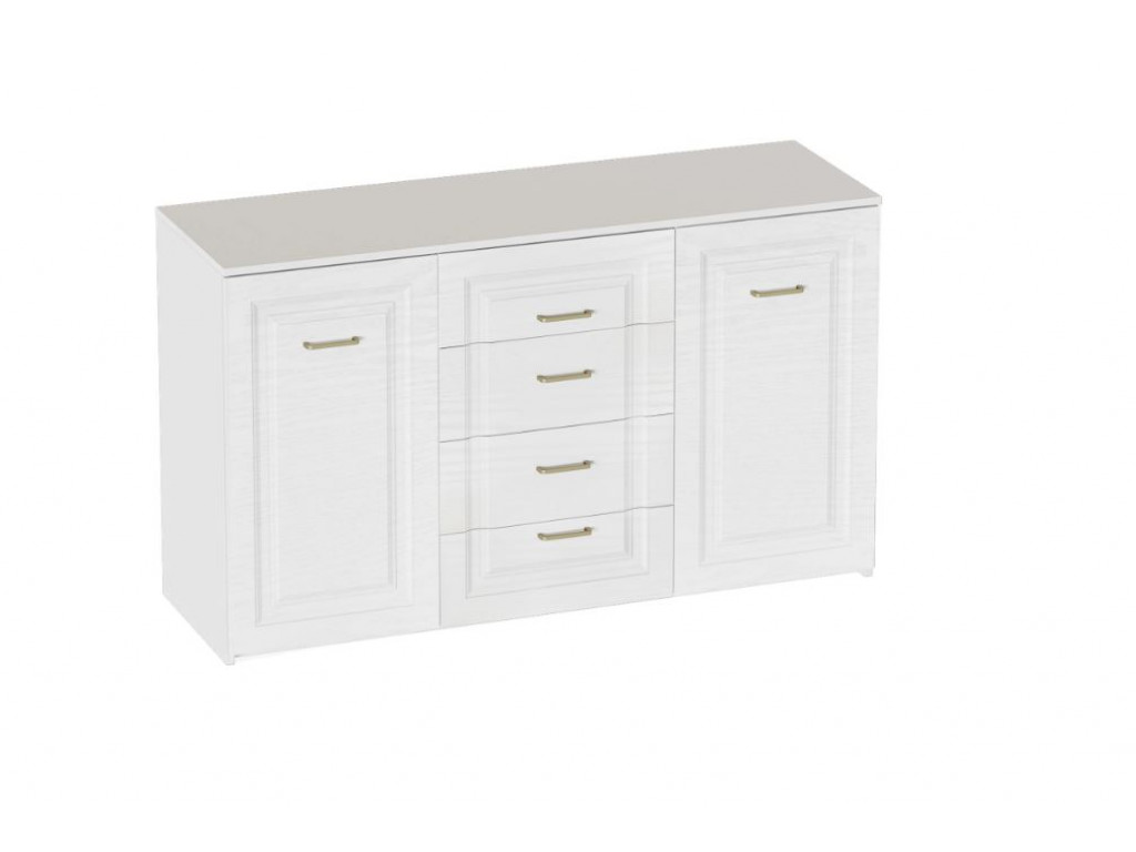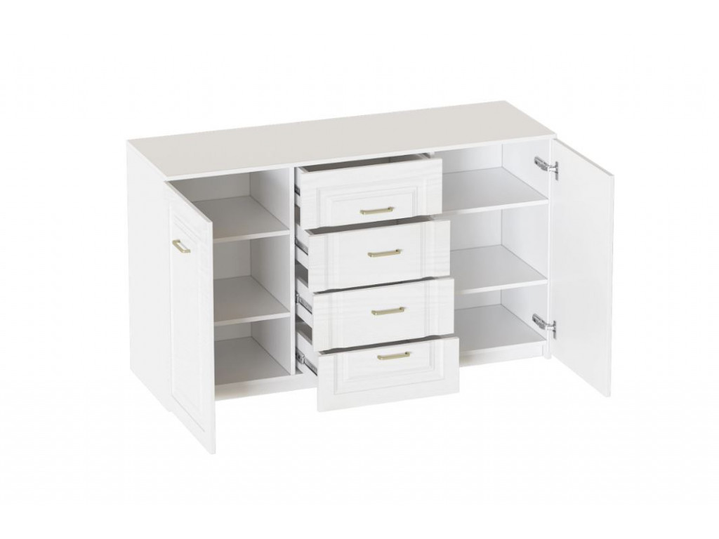 Комод выполнен в цвете Айс 06 / Белый Аляска. Классическая фрезеровка фасадов и ручки-скобы из брашированного золота придают изделию особый шарм и элегантность. Комод с полупроходными боками, прямоугольной крышкой и дном. Внутри пространство разделено на три секции. В средней секции расположены 4 ящика на шариковых направляющих без доводчика, крайние секции закрыты распашными дверями на петлях с доводчиком, за которыми расположены съемные полки. Дно и задние стенки выполнены из ХДФ. На опорах размещены войлочные подпятники.