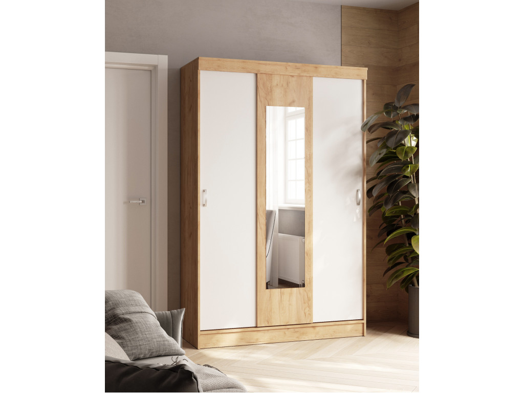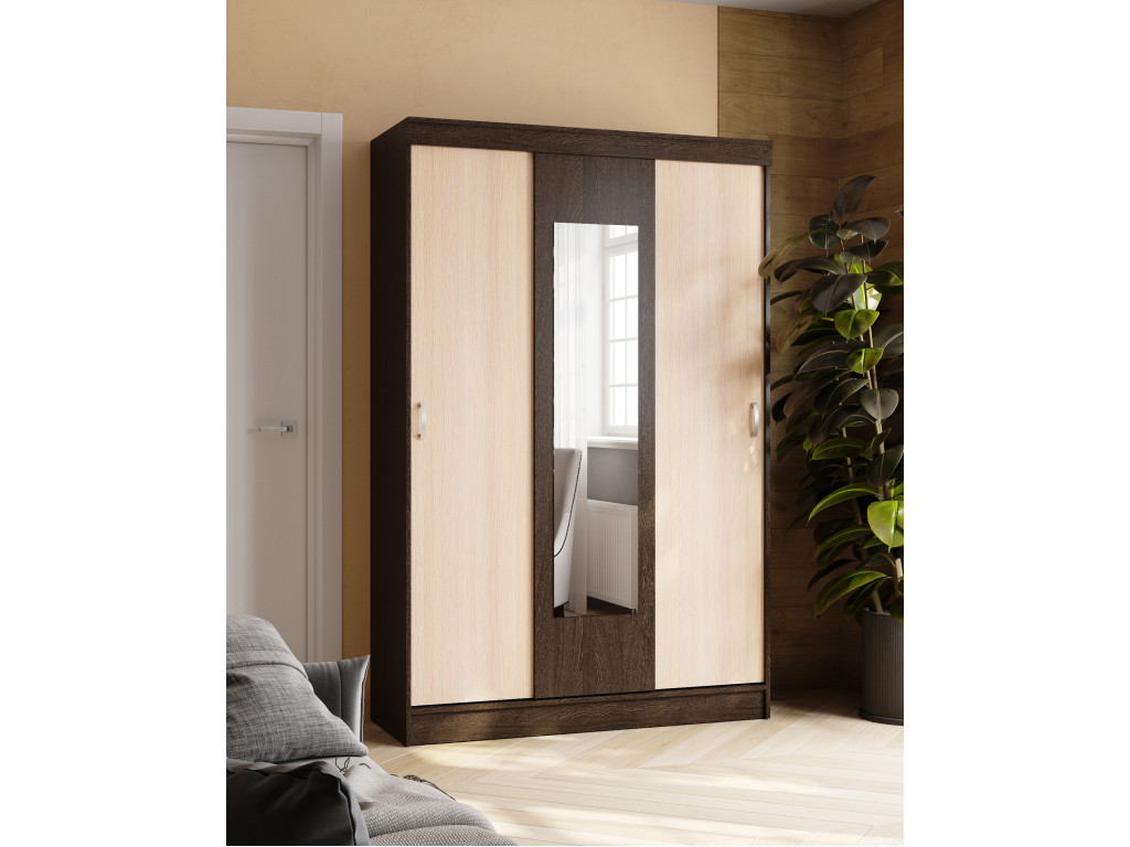 Фасад украшает большое зеркало в размер центральной секции, что не только практично и поможет оценить свой облик при смене гардероба, но и визуально расширит пространство комнаты, сделает интерьер более живым и привлекательным.
