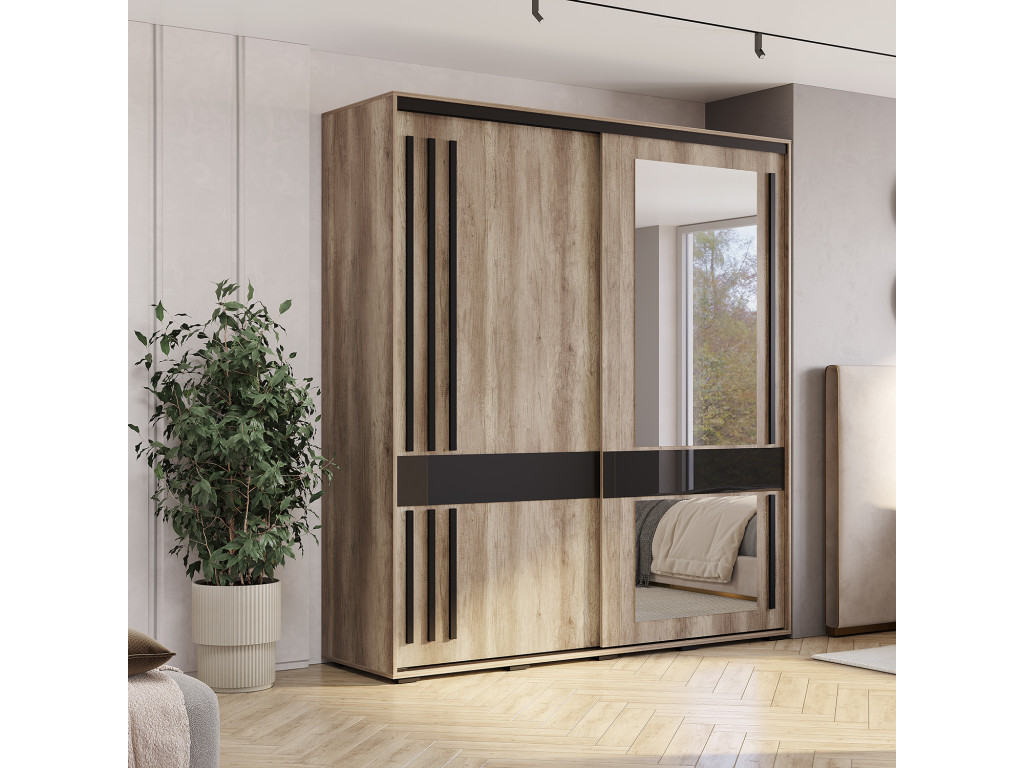 Шкаф-купе "Крафт-8" выполнен в натуральном теплом декоре, повторяющем текстуру дерева. Двери шкафа украшены удлиненными черными ручками из МДФ-профиля, которые гармонично сочетаются с основным цветом и обеспечивают комфортное открытие. Шкаф комплектуется большим зеркалом, которое увеличивает пространство и создает стильный акцент, а черный лакобель придает современный и элегантный вид.