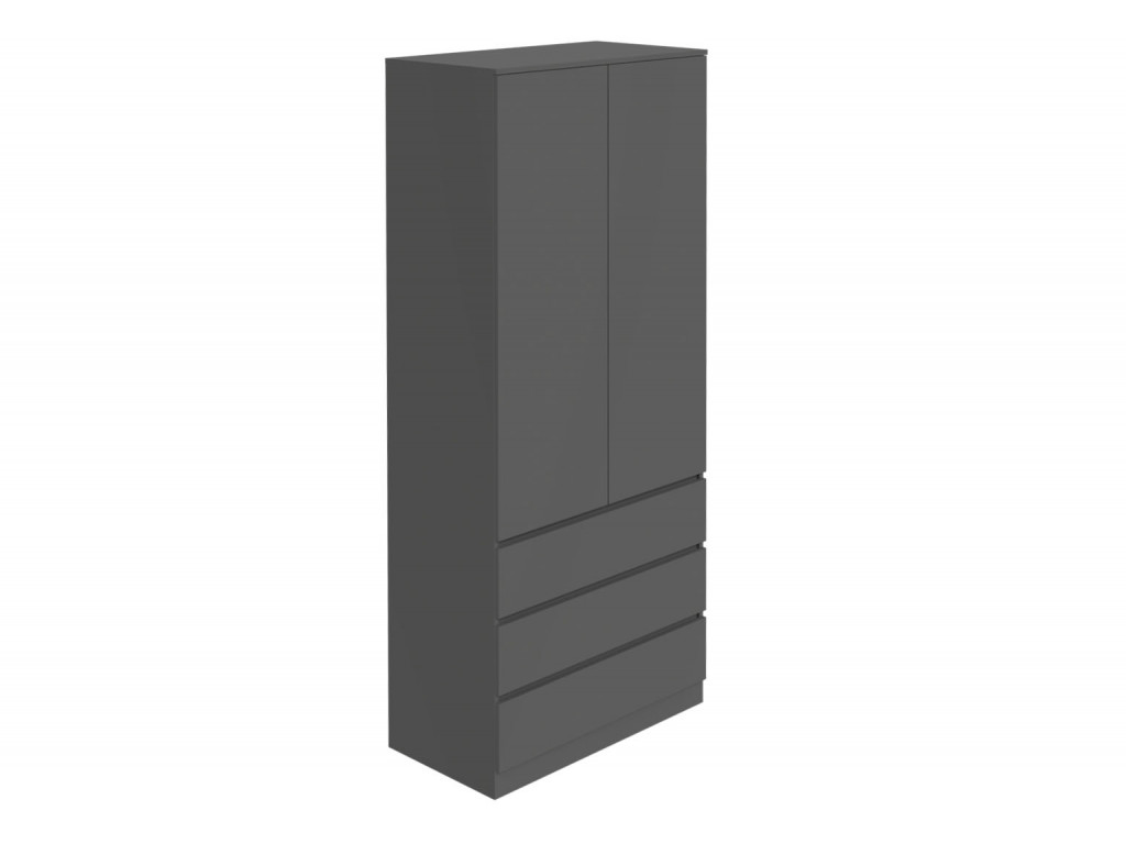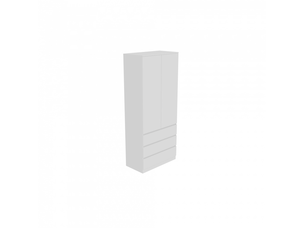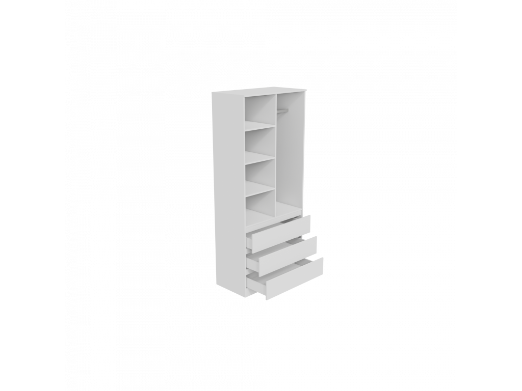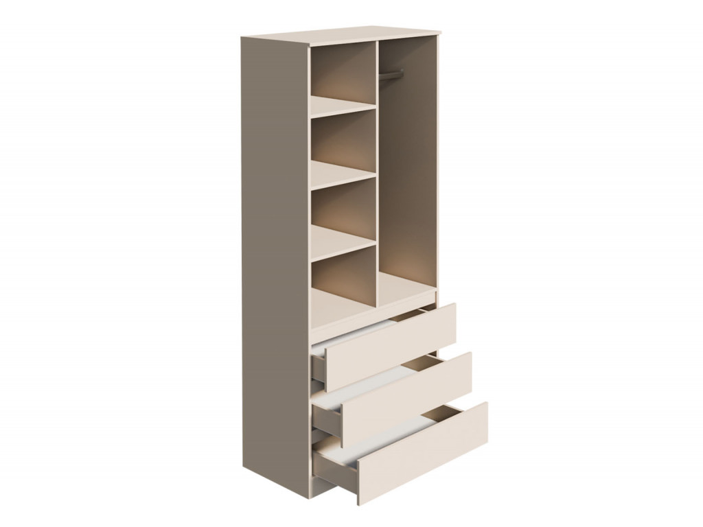 Особенности: – Распашные дверцы и три вместительных выдвижных ящика. – За распашными дверцами полки и штанга для вешалок. – Выдвижные ящики на роликовых направляющих.