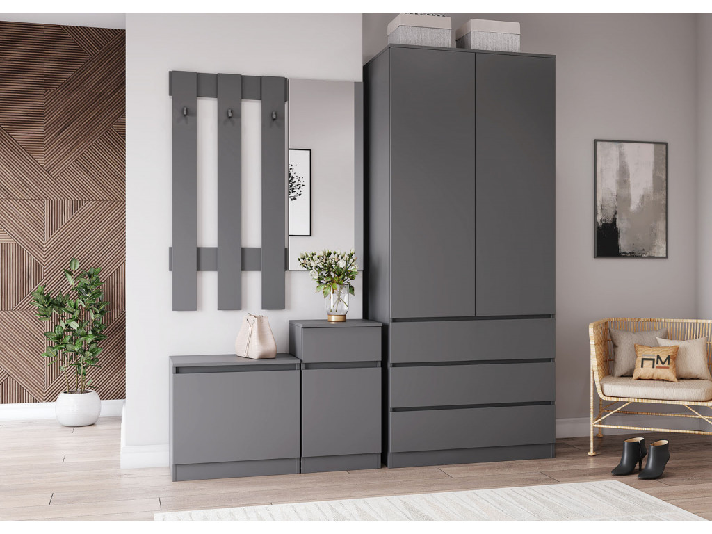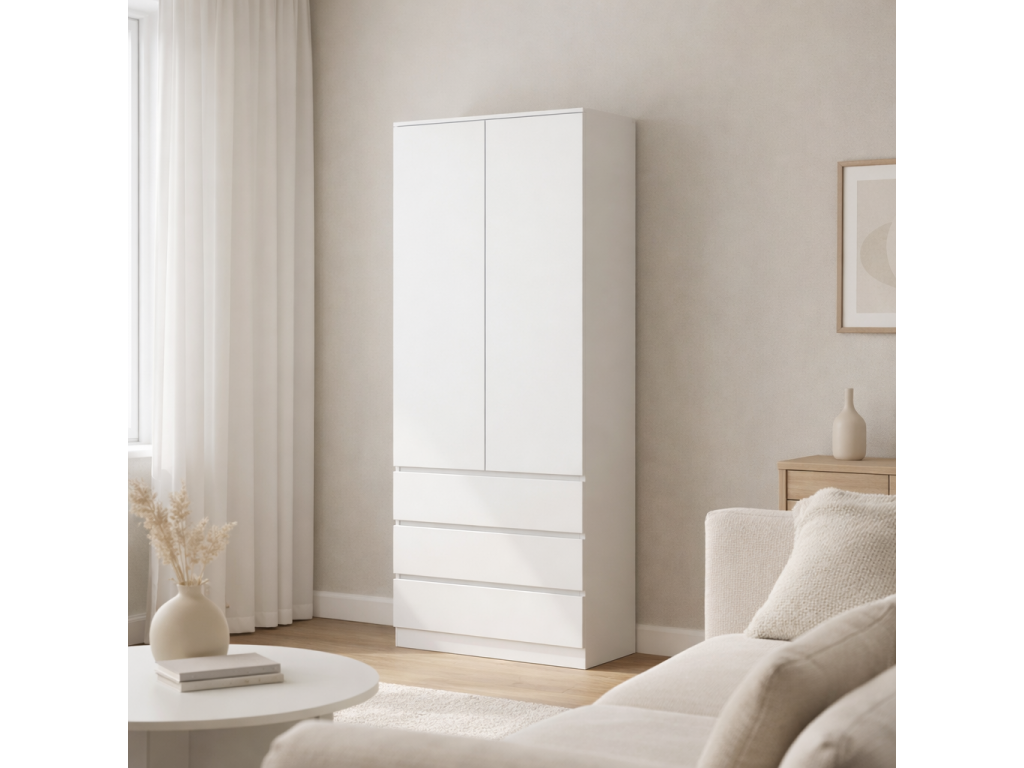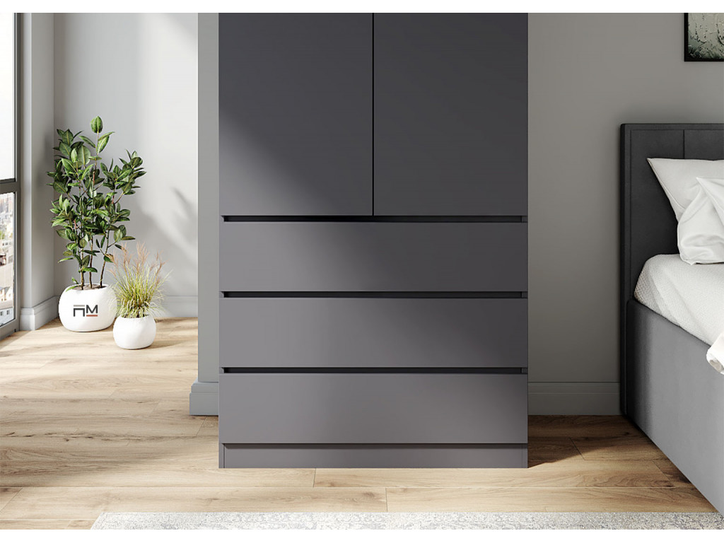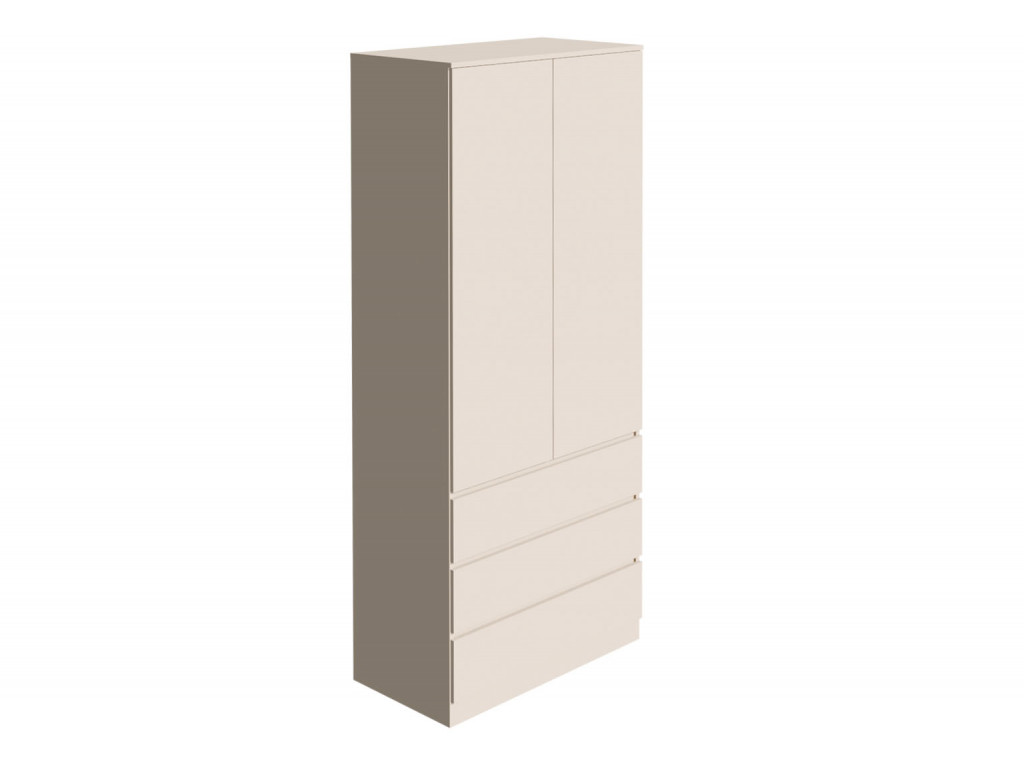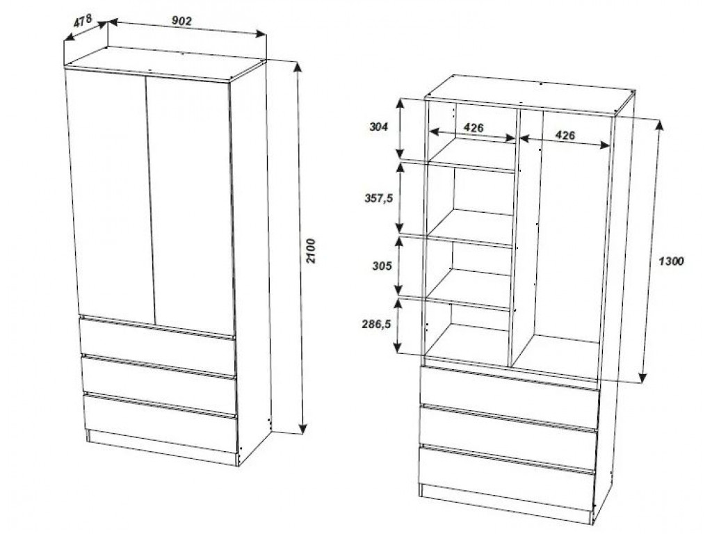 Особенности: – Распашные дверцы и три вместительных выдвижных ящика. – За распашными дверцами полки и штанга для вешалок. – Выдвижные ящики на роликовых направляющих.