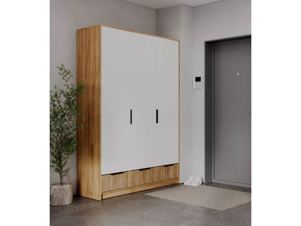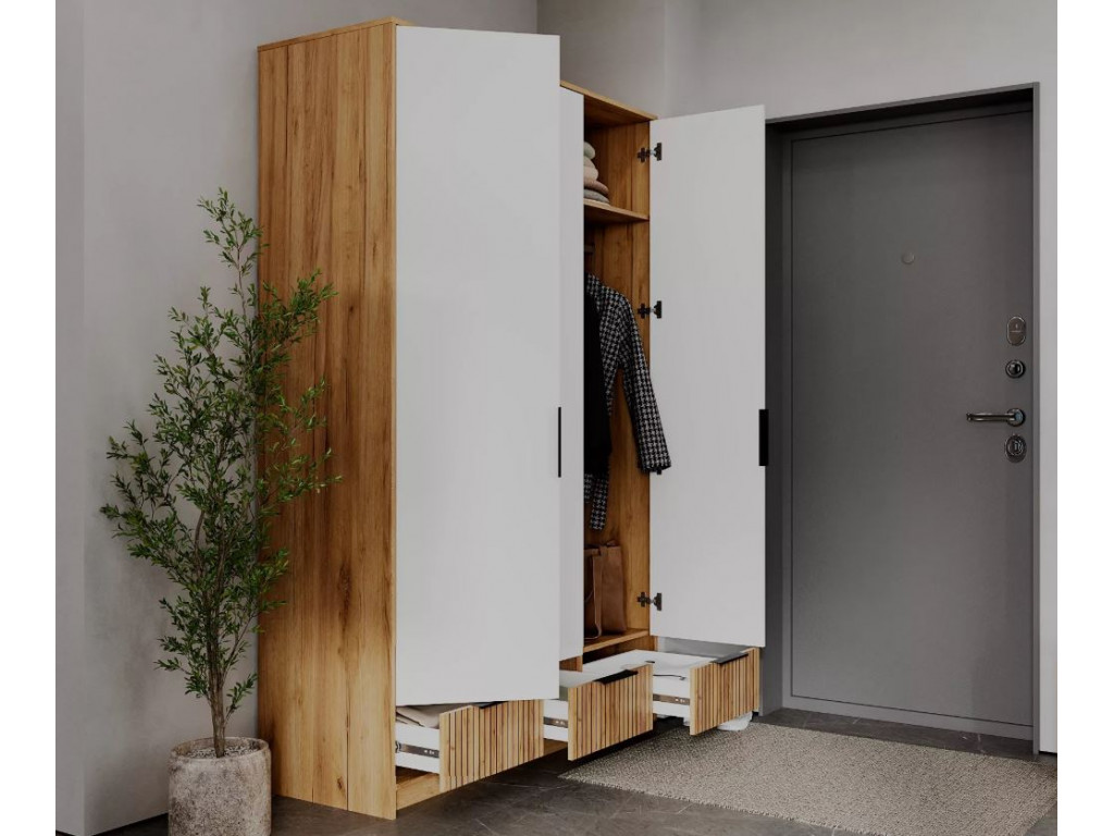 Имеет 3 отделения: центральный - для хранения вещей на полках и вешалках, нижний – с тремя ящиками для мелких вещей или нижнего белья, верхний – антресольный.