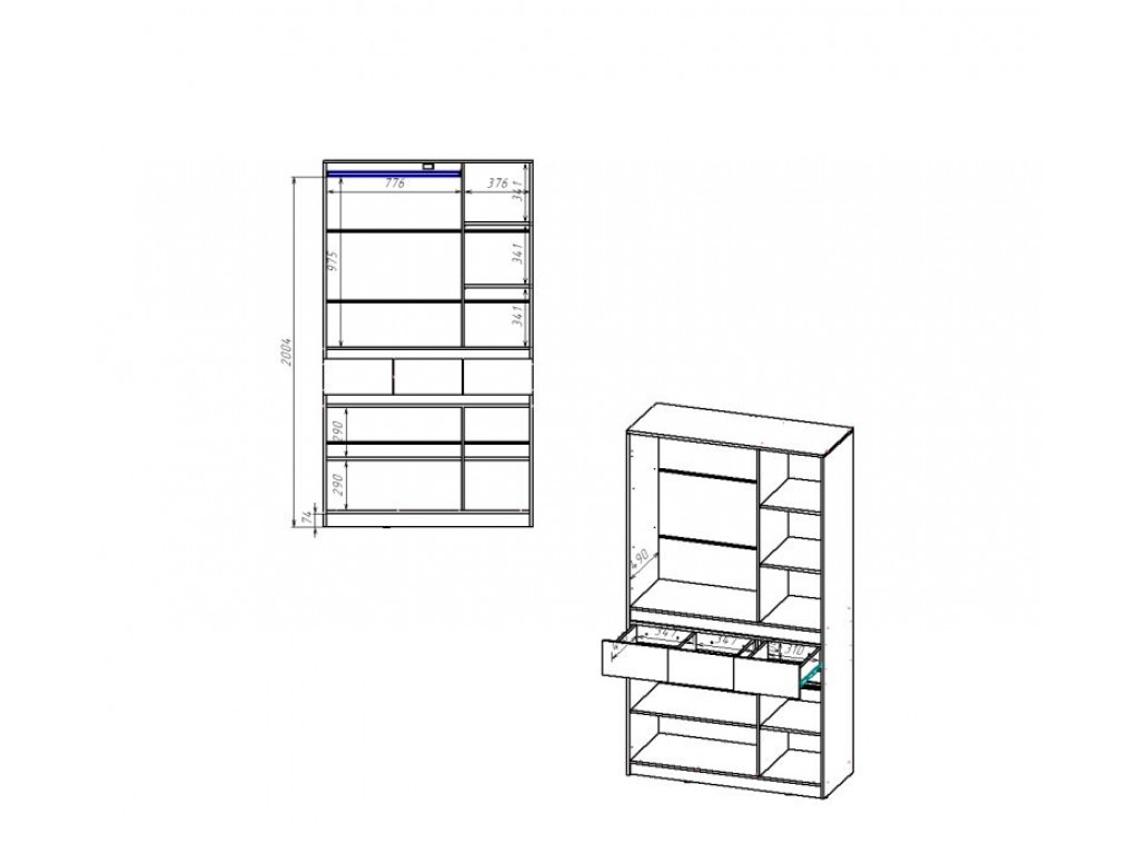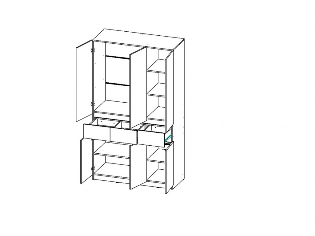 Верхняя часть: - Отделение под штангу для плечиков (776 × 1055 × 490 мм). - Секция с 2 съёмными полками (3 ниши 376 × 341 × 490 мм).