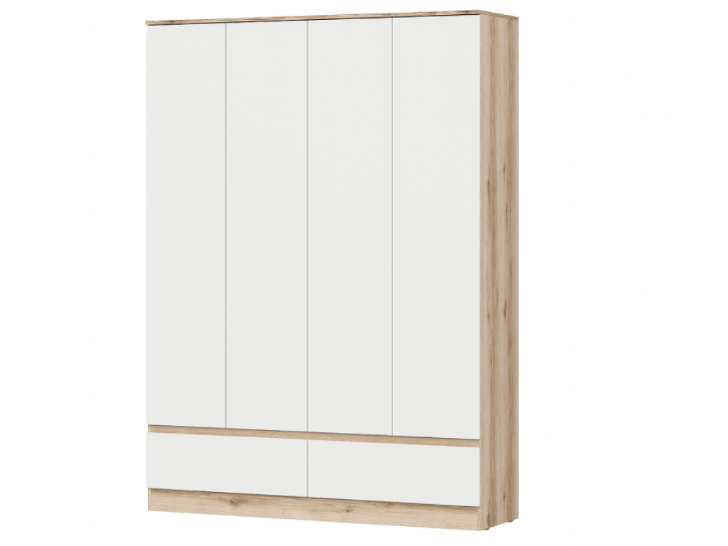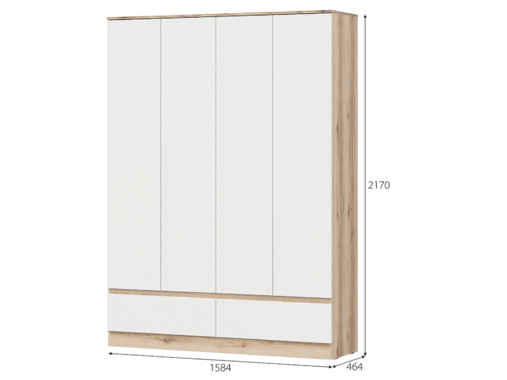 Стильный и вместительный четырехсторонний шкаф в современном цветовом сочетании дуб делано и белый. Общая ширина составляет 1584 мм, высота — 2170 мм, а глубина — 464 мм, что обеспечивает большое внутреннее пространство для хранения одежды и аксессуаров.
