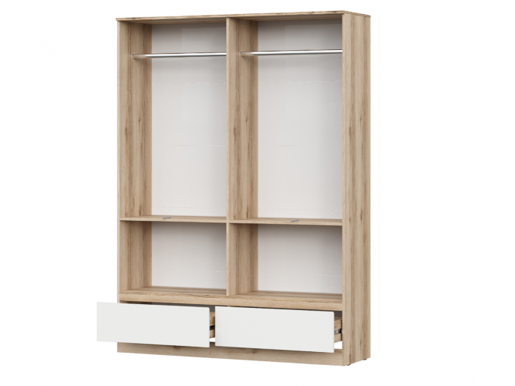 Внутри шкафа расположены два просторных отделения, каждое оснащено штангами для аккуратного хранения верхней одежды и платьев. Дополнительно шкаф укомплектован двумя удобными ящиками, которые отлично подходят для хранения мелких предметов, белья или обуви.