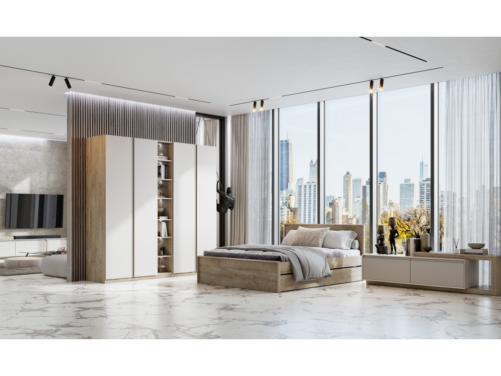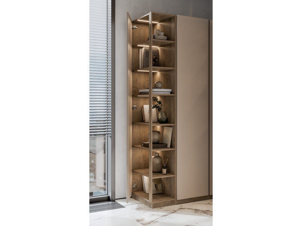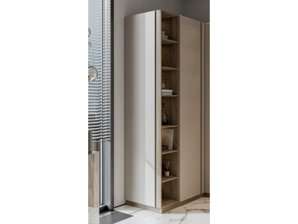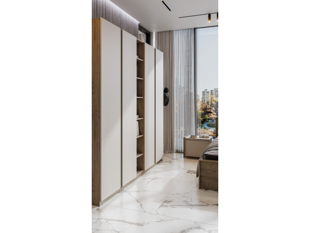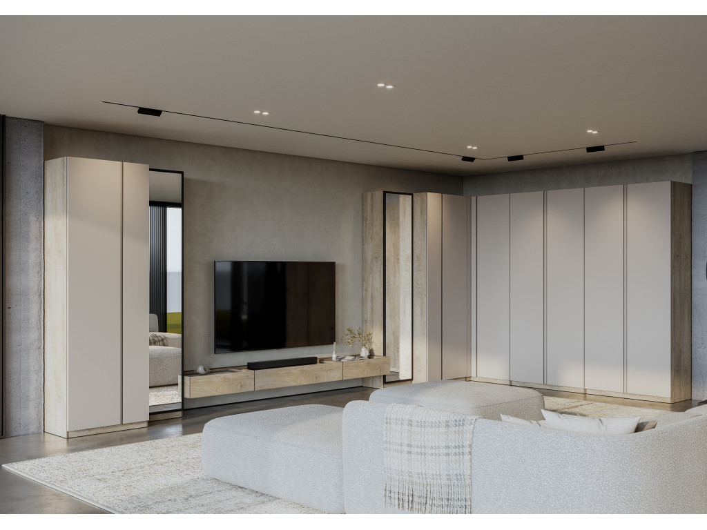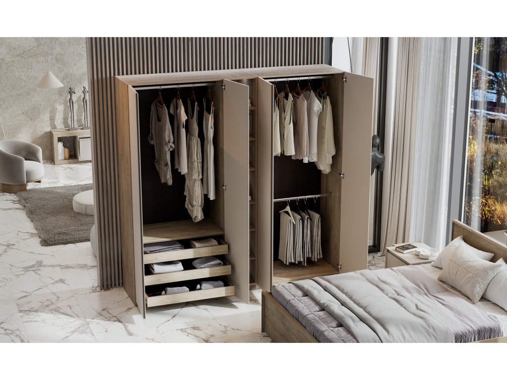 Гардеробная система Этна – это уникальная серия, включающая корпуса, распашные фасады и разнообразное наполнение (ящики, полки, штанги, выкатные брючницы). Вы сможете организовать продуманное хранение одежды и вещей в любом помещении, от прихожей до рабочего кабинета, с учетом его размера и Ваших запросов. Трендовый декор фасадов «Кашемир» гармонично дополняет сложный древесный декор корпуса «дуб эндгрейн».