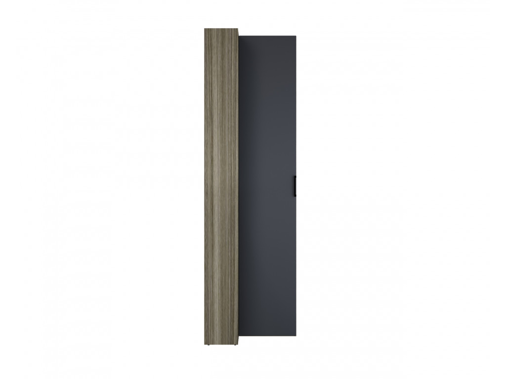 Каркас шкафа выполнен в контрастном сочетании материалов: текстура ЛДСП «Джара темная» и благородное матовое покрытие МДФ «Хангва». Такая цветовая гамма формирует глубокий, насыщенно-темный интерьер, который визуально успокаивает и помогает расслабиться после напряженного дня.